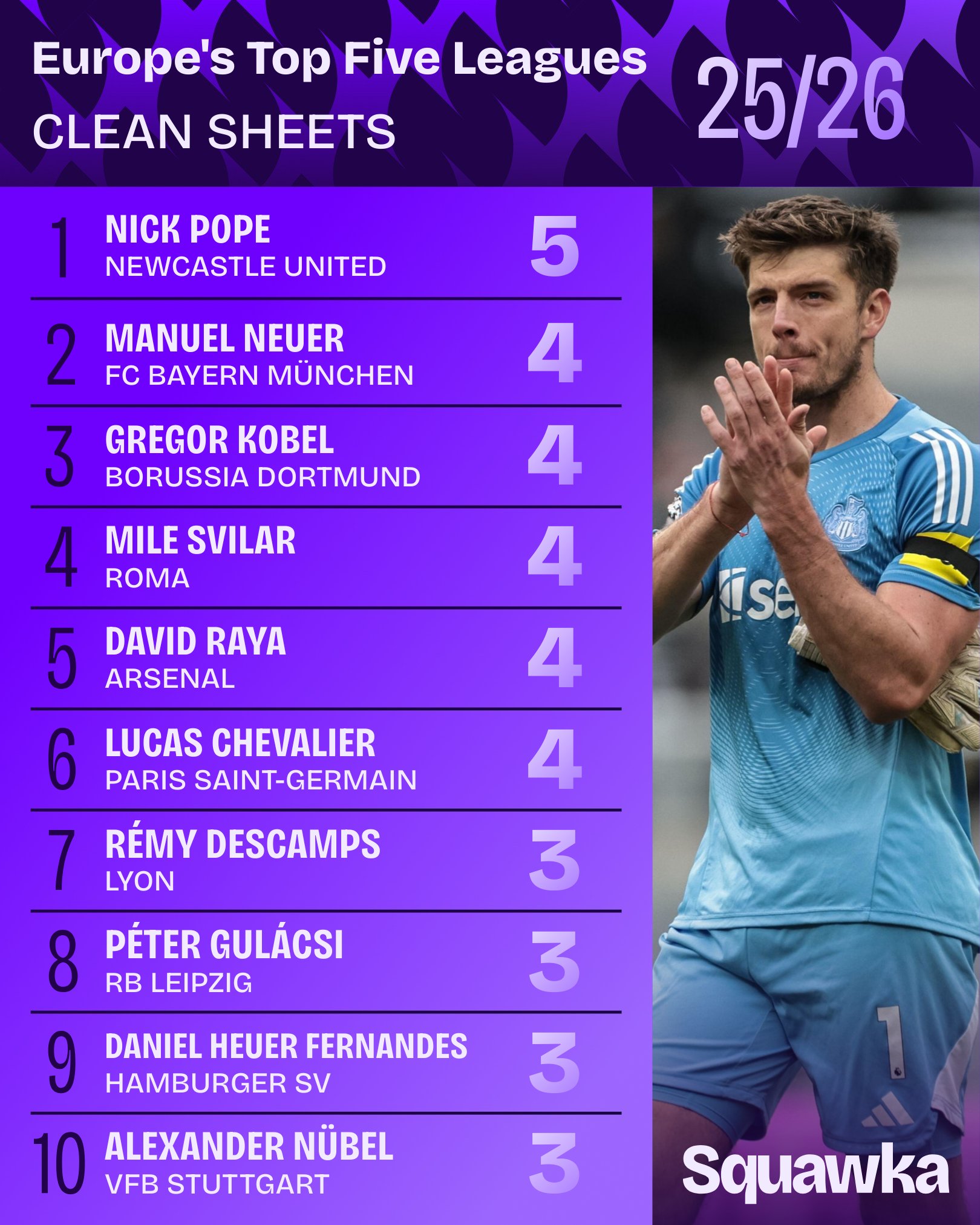 虎扑10月16日讯Squawka数据统计本赛季至今五大联赛零封榜,波普5次居首。