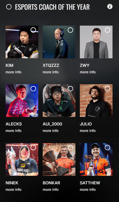最佳教练奖中,成都AG主教练awy获得提名,其余提名教练包括GEN英雄联盟的KIM、PRX无畏契约的alecks、VitalityCS2的XTQZZZ等人。