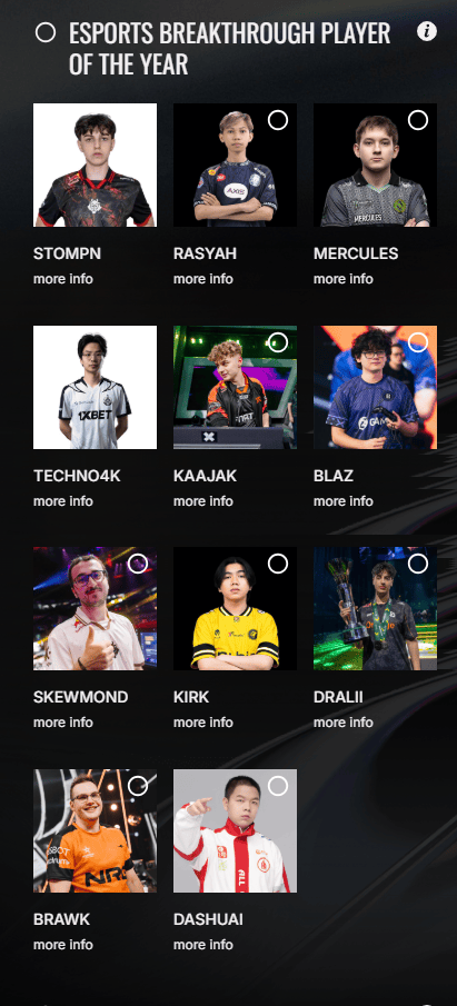 而在最佳突破选手奖中,成都AG辅助大帅获得提名,其余提名选手包括G2英雄联盟分部打野SkewMond,NRG无畏契约选手brawk、FNC无畏契约选手kaajak、TheMongolZCS2分部选手Techno4K、电竞世界杯街霸6亚军Blaz等人。最佳突破选手奖表彰的是在过去一年中刚出道就打出优异成绩或是在这一年中取得重大成绩突破的选手。