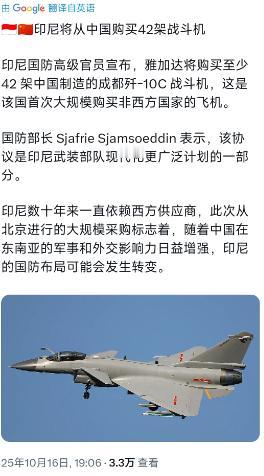 当地时间 10 月 16 日,多家外媒披露,印尼要从中国成都买 42 架歼 - 10C 战斗机,花的钱超过 90 亿美元,印尼国防高级官员直接点明,这是该国头一回大规模买非西方国家的飞机。   这事儿可太不一般了,要知道印尼空军几十年来都是盯着西方战机买,突然转向中国,背后全是实实在在的考量,可不是一时脑袋发热。先说说这事儿的实锤程度。   其实早在 9 月初,印尼那边就有传闻说总统普拉博沃要敲定这笔买卖,当时法国 “情报在线” 还提过资金问题让合同推迟了一阵。但现在不一样了,印尼防长沙夫里 10 月 15 日直接放话,说中国造的歼 - 10 战斗机不久将飞抵雅加达,虽然没说死具体交付时间,但这已经是官方最明确的表态了。   财政部长普尔巴亚都证实了,他已经批了国防部那笔约 90 亿美元的预算申请,还主动打听 “这些飞机啥时候从北京运过来”,这话里的意思再明白不过 —— 钱到位了,就等发货了。   连印尼国民军少将弗雷迪都出来回应,说军方早就准备好配套的维护设备、技术保障和人员培训,就等国防部最后拍板执行了。为啥印尼放着西方战机不买,非要头一回大规模选非西方国家的飞机?   这话得从它这些年的军购糟心事说起。之前印尼想买俄罗斯的苏 - 35,2018 年就谈了,结果硬生生被搅黄了,一直搁着没下文。后来瞅着美国的 F-35 眼馋,跑去求购,直接被美国拒了,人家连 F-16 的提议都没让他们满意,最后印尼干脆也拒了美国的方案。   2022 年倒是跟法国签了买 42 架 “阵风” 的协议,花了 81 亿美元,可首批得等到 2026 年才交付,这猴年马月的事儿,印尼空军等不起啊。   反观歼 - 10C,那是真的靠实力打动了印尼。美国《军事观察》杂志之前专门对比过歼 - 10C 和美国的 F-16V,结论是歼 - 10C 有压倒性优势。   别看俩机型都是单发轻型战机,重量、雷达大小差不多,但歼 - 10C 的设计新多了,2006 年才入役,比上世纪 70 年代就定型的 F-16 先进一代。发动机方面,歼 - 10C 用的 WS-10B 带三维推力矢量,飞得又快又灵活,F-16V 还没这配置。   武器上更没法比,歼 - 10C 能挂 PL-15 空空导弹,射程能到 250-300 公里,而 F-16V 现在装的还是射程短一截的 AIM-120C。更绝的是歼 - 10C 有红外搜索跟踪系统,能悄摸摸锁定隐形战机,还不用开雷达暴露自己,这本事 F-16 根本没有。   而且歼 - 10C 早有实战背书。今年 5 月印巴冲突,巴基斯坦用歼 - 10C 打了漂亮仗,巴军方直接夸中国武器 “异常出色”,这事儿在国际军购圈传开了,印尼不可能没听说。   中国卖武器从不附加政治条件,不像西方动不动就拿人权、外交政策说事,而且配套的维护、售后都跟得上,这对想自主掌控国防的印尼来说太重要了。   90 亿美元对印尼可不是小数目,但这笔钱花得值。印尼这两年一直在推进军事现代化,前段时间刚批准贷款买意大利退役的航母,现在又敲定战斗机,明显是想提升区域防务能力。   财政部长敢批预算,也是算过账的 —— 对比法国 “阵风”,歼 - 10C 性能不差,价格还更实在,而且交付肯定比 “阵风” 快,能早点补上印尼空军的装备缺口。   这事儿最耐人寻味的是 “首次大规模买非西方飞机” 这个点。美联社直接说,这是中国在东南亚军事与外交影响力增长的信号,印尼的安全方向在变。其实这也是印尼的无奈之举,被西方卡了这么多年脖子,总得找个靠谱的出路。   之前印尼军方就说了,选歼 - 10C 是兼顾了现代化需求和预算性价比,还专门审查了战机和现有系统的兼容性,显然是深思熟虑的结果,不是一时冲动。现在外界都在猜西方会不会有反应,但从印尼的态度看,这次是铁了心了。   从 9 月初传闻发酵,到国防部审查评估,再到财政部长批预算、防长放话,一步步推进得很稳。毕竟对印尼来说,国防装备是用来保家卫国的,不是用来讨好谁的,哪款战机好用、划算、不附加条件,就选哪款,这道理再简单不过。   歼 - 10C 能从美法等国的竞争中突围,靠的是硬实力,而印尼敢打破几十年的传统选择非西方装备,靠的是想自主掌控防务的决心。接下来就等着看这批战机飞抵雅加达,这事儿不管对中国军工还是印尼国防,都是实打实的双赢。