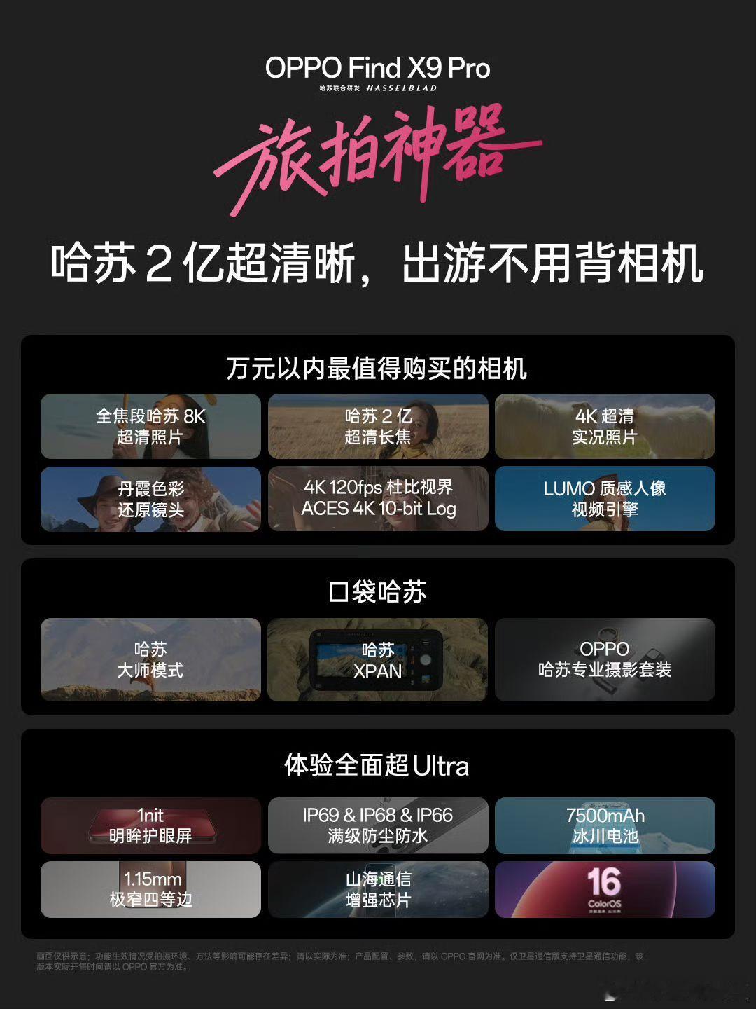 影像才是真王牌:Pro版的2亿像素长焦太能打,5倍变焦还能拍清发丝细节,全系有哈苏色彩调校,夜景高光暗部平衡得特好 。最绝的是4K超清实况,每一帧都能当封面图用,女生拍娃拍景都爱了OPPOFindX9挑战万元相机