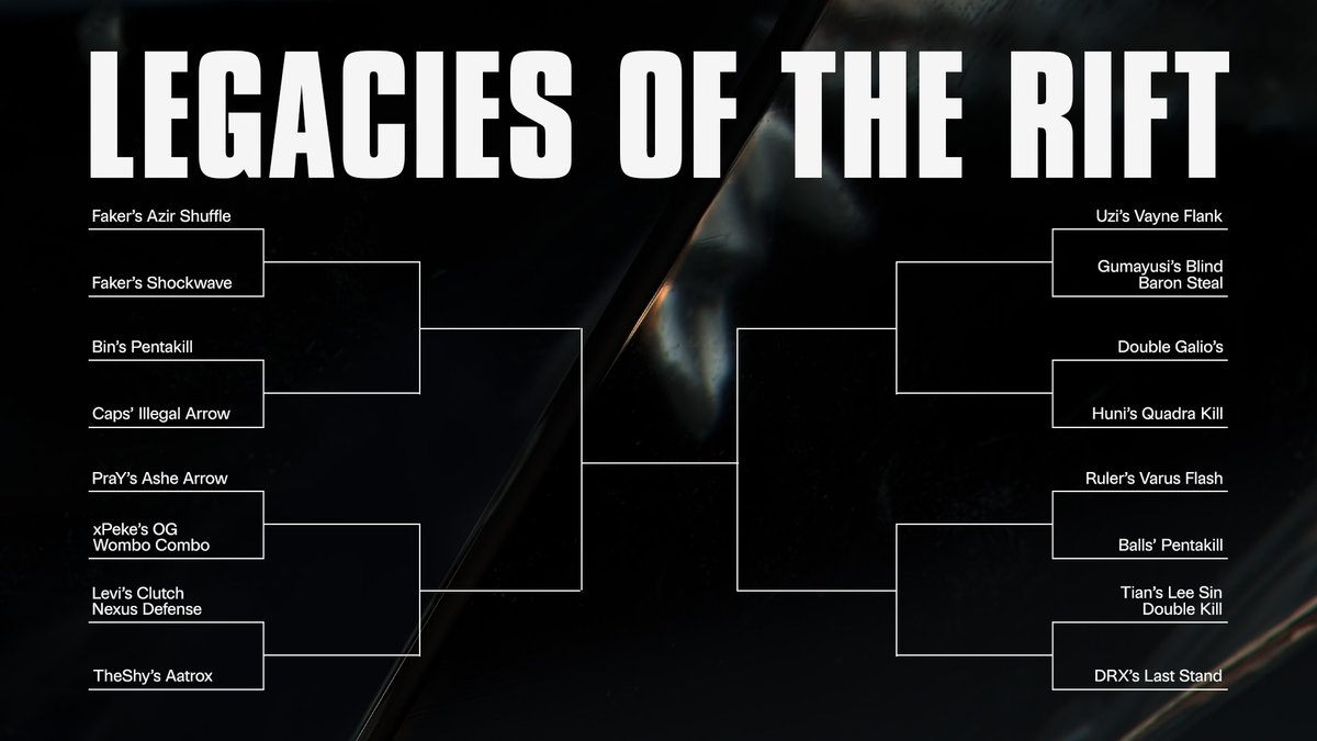 我们已将全球总决赛历史上部分最令人难忘的赛场操作整理成候选对阵表。如今,我们希望在社区成员、媒体及解说的共同参与下寻找答案:哪一个名场面,才是当之无愧的史上最难忘瞬间?