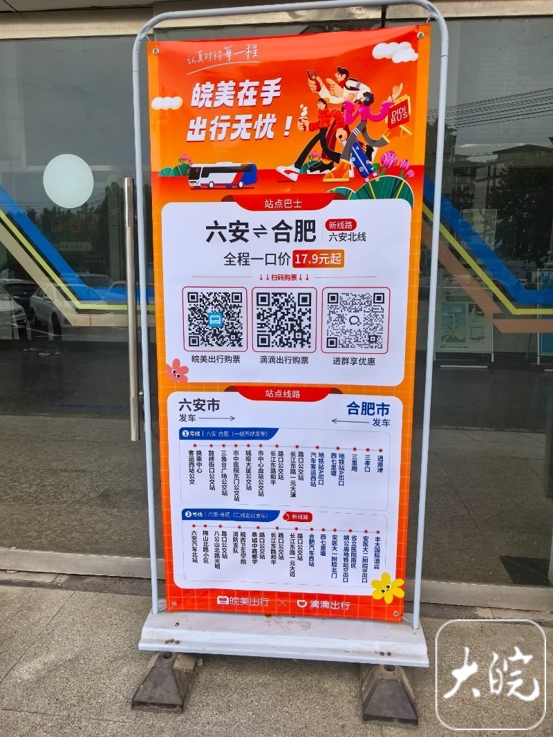 大皖新闻记者来到六安汽车客运北站看到,站房大楼门前放置有六安至合肥站点巴士公告牌,牌上醒目标注“全程一口价17.9元起”。分别列出从六安汽车客运西站公交换乘中心始发的1号线经停站点(曾多次报道),以及从六安汽车客运北站始发的、新开的2号线经停站点。