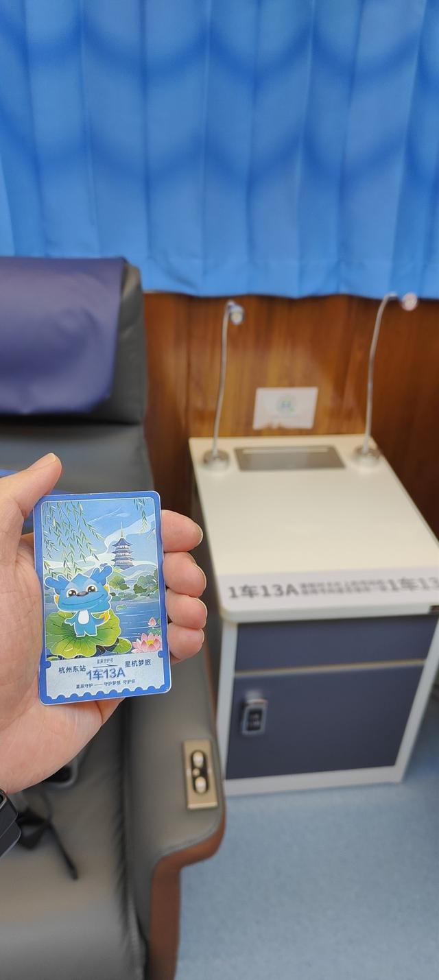 手机扫一下前台二维码,登记姓名、性别、身份证号和出发车次时间,将身份证交给工作人员登记后,就领到一张标着座位号的智能卡片。找到自己休息的沙发,旁边有智能保险柜,可以存放个人物品,还有小夜灯,USB与三孔、两孔插座。沙发宽大舒服,可以电动调节靠背和腿托。