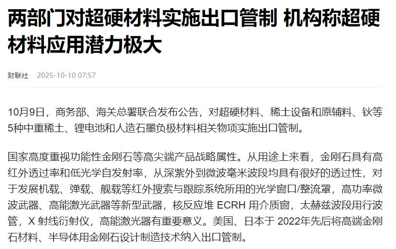 中方严控人造钻石出口,俄专家长出了一口气:他们总算醒悟了! 我商务部10月9日发布公告,宣布从11月8日开始,超硬材料及相关物项就要实施出口管制了,像人造金刚石微粉、单晶还有关键的制备设备都在管控范围内。而我们之所以这么做,根本上是为了守护咱们高端制造产业链的安全。 大众对人造钻石的认知大多停留在装饰层面,却不知道它在工业领域的用处早就渗透到了咱们生活的方方面面。 就拿半导体制造来说,芯片生产离不开晶圆切割,这个过程需要极高硬度和导热性的材料,人造金刚石正好能满足需求,它制成的切割工具直接决定了芯片的精度和生产效率。 在航空航天领域,发动机部件要承受高温和磨损,用人造金刚石制造的部件就能大幅提升飞行器的性能稳定性。哪怕是新能源电池和精密医疗器械,高品质的工业级人造钻石也是必不可少的关键耗材。 毫不夸张地说,能不能稳定供应工业级人造钻石,直接影响着高端制造业的发展步伐。 正因为工业级人造钻石这么重要,中国在这个领域的实力才更值得关注。全球90%以上的人造金刚石产量都来自我们,技术水平同样也走在世界前列。 但这种领先优势也带来了潜在风险,如果关键产品和技术随便出口,不仅可能让核心技术泄露出去,还可能导致国内高端产业反过来依赖进口的尴尬局面。 而这次管制也不是要限制正常的国际贸易,而是通过规范出口管理,让有限的优质资源先满足国内重点产业的需求,避免出现被别人“卡脖子”的情况。 商务部在公告里说得很清楚,管制的目的是维护国家安全和利益,促进产业健康发展,这既符合国际上的通行做法,也是保障咱们国内产业链供应链安全的必要手段。 从产业自身发展来看,这次管制还能推着国内人造钻石产业往高端化方向走。 以前有些企业为了赚快钱,专门出口低附加值的产品,不仅卖不上好价钱,还造成了资源浪费,甚至容易引发国际贸易摩擦。现在重点管控工业级产品出口,企业就会把更多精力放在研发生产高纯度、大尺寸单晶这些高端产品上,整个产业的竞争力自然会提升。 同时,对关键制备设备的出口管理,也能有效防止技术外流,让中国在人造金刚石领域的技术优势保持下去。 值得一提的是,大家平时关注的珠宝级人造钻石并没有被纳入管制,民用市场不会受到影响,这种精准管控的方式真正做到了既守好安全底线,又不影响正常消费。