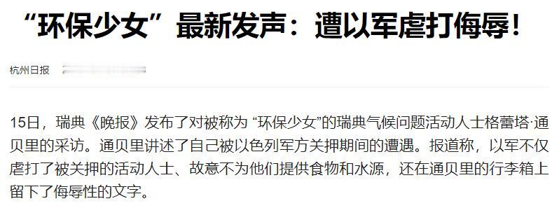 “环保少女”遭以色列虐待:拳打脚踢,脱光拍照,像狗一样喝水。 10月15日,瑞典《晚报》发布的一篇专题报道,让“环保少女”通贝里的遭遇引发全球关注。报道披露,通贝里因参与人道主义救援行动、冲击以色列海上封锁线声援加沙,在被逮捕监禁期间遭受了一系列令人发指的虐待: 不仅遭到以色列士兵的拳打脚踢,还被额外照顾置于一面以色列国旗旁边,一但身体触碰到国旗就会被打一顿,甚至还被强迫脱光了拍照。 所有被抓的志愿者的有关巴勒斯坦的物品全部被当面销毁,就连一些事关志愿者生死的随身药品(比如心脏病药、胰岛素之类)也同样被以军没收。 以军看守晚上还经常会拿铁棍子敲打牢房门,以此来消磨志愿者的意志。水和食物自然是基本没提供,偶尔有点水还因为志愿者们体力不支只能跟狗一样舔食。 面对这些指控,以色列外交部却发表声明,将其斥为“无耻谎言”,声称“所有被扣押者的合法权利都得到充分维护”。这种苍白的回应显然是在找借口,意图掩盖他们对被扣押人员实施的不法虐待行为。 而通贝里这个人,本身就是个充满争议的公众人物。2003年出生的她,2018年因为发起“为气候变化而罢课”的行动走红,之后推动了全球400万人参与的“全球气候大罢工”,还多次在联合国气候变化会议上演讲。 但她的环保主张却很激进,比如呼吁采取极端手段限制工业发展来应对气候变化,这种脱离现实的观点遭到不少专业人士质疑,让她在环保领域的公信力一直备受争议。 可这次跨界参与人道救援,她不再只是口头呼吁,而是亲自上阵运送物资、直面封锁,这种敢于把立场付诸行动的勇气,和她之前在环保议题上的争议形象形成了鲜明反差。 不过也有人质疑,她可能对复杂的巴以局势缺乏足够认知,贸然行动或许不够理智。 事件曝光后,国际社会的关切声不断,一些人权组织负责人已经在接受媒体采访时表示,会密切关注事件进展,并且呼吁对这些虐待指控进行彻底调查。 不管怎样,在现代文明社会里,任何形式的虐待行为都绝不应该被容忍,哪怕是针对被扣押人员,他们的基本人权也必须得到保障。 通贝里身上的争议性和她行动中展现出的勇气,让这个事件成了一个审视公众人物责任与担当的典型案例,值得大家从不同角度理性思考和探讨。