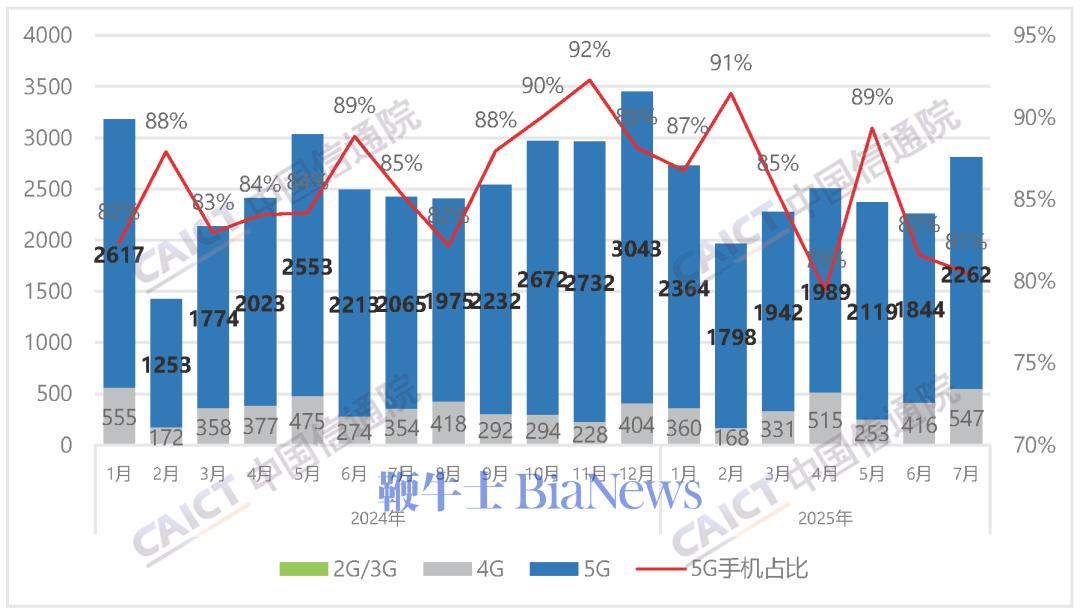 2025年1-7月,国内市场手机出货量1.69亿部,同比下降1.1%,其中,5G手机1.43亿部,同比下降1.2%,占同期手机出货量的84.7%。
