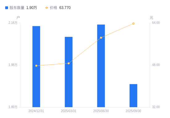 日期A股户数(户)流通A股户均持股数(股)户均持股市值(万元)2025-09-301898787561.03558.382025-06-302152977222.41450.902025-03-312100679145.07385.042024-12-312146477456.27369.852024-09-302637563033.98294.492024-06-302266373358.39331.952024-03-312307672047.17304.762023-12-312361770396.77303.482023-09-302534565597.18285.022023-06-302699761583.16274.62