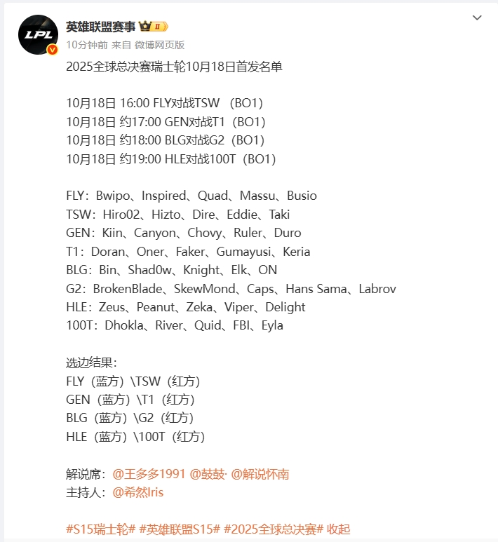 直播吧10月17日讯2025全球总决赛瑞士轮10月18日首发名单公布,明天将迎来1-1组别的四场Bo1。
