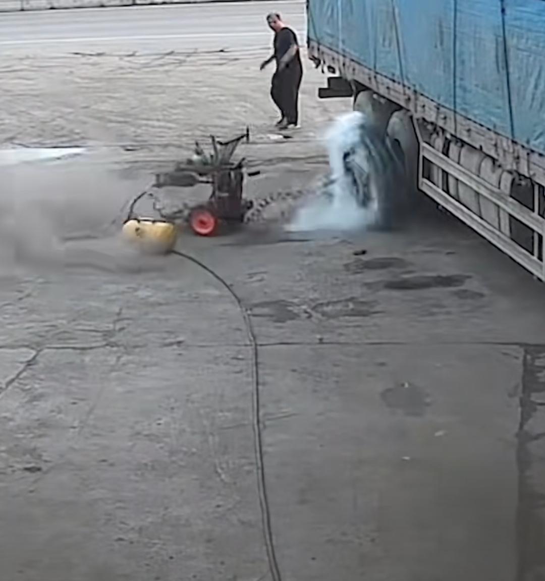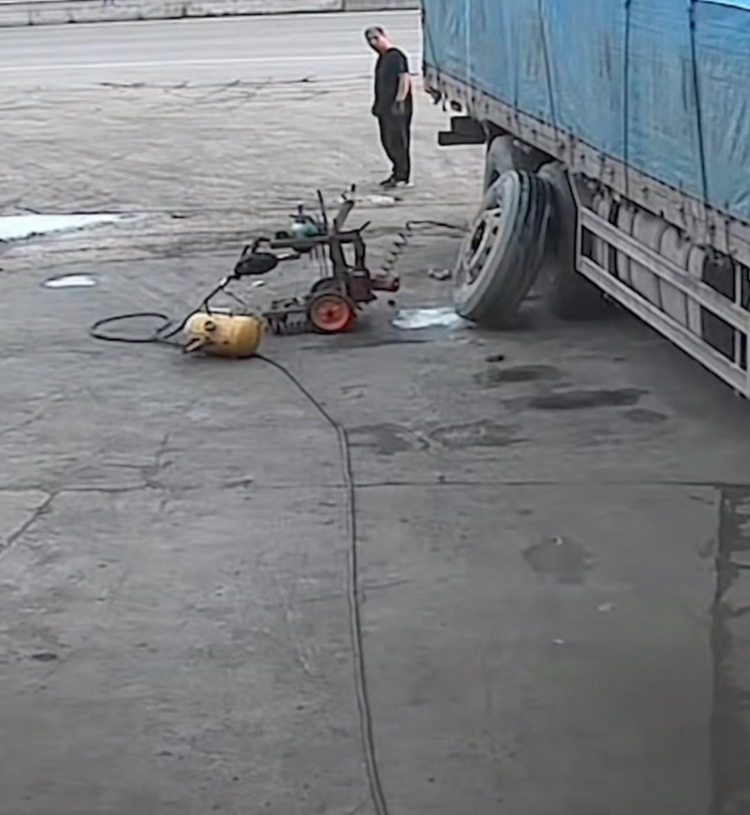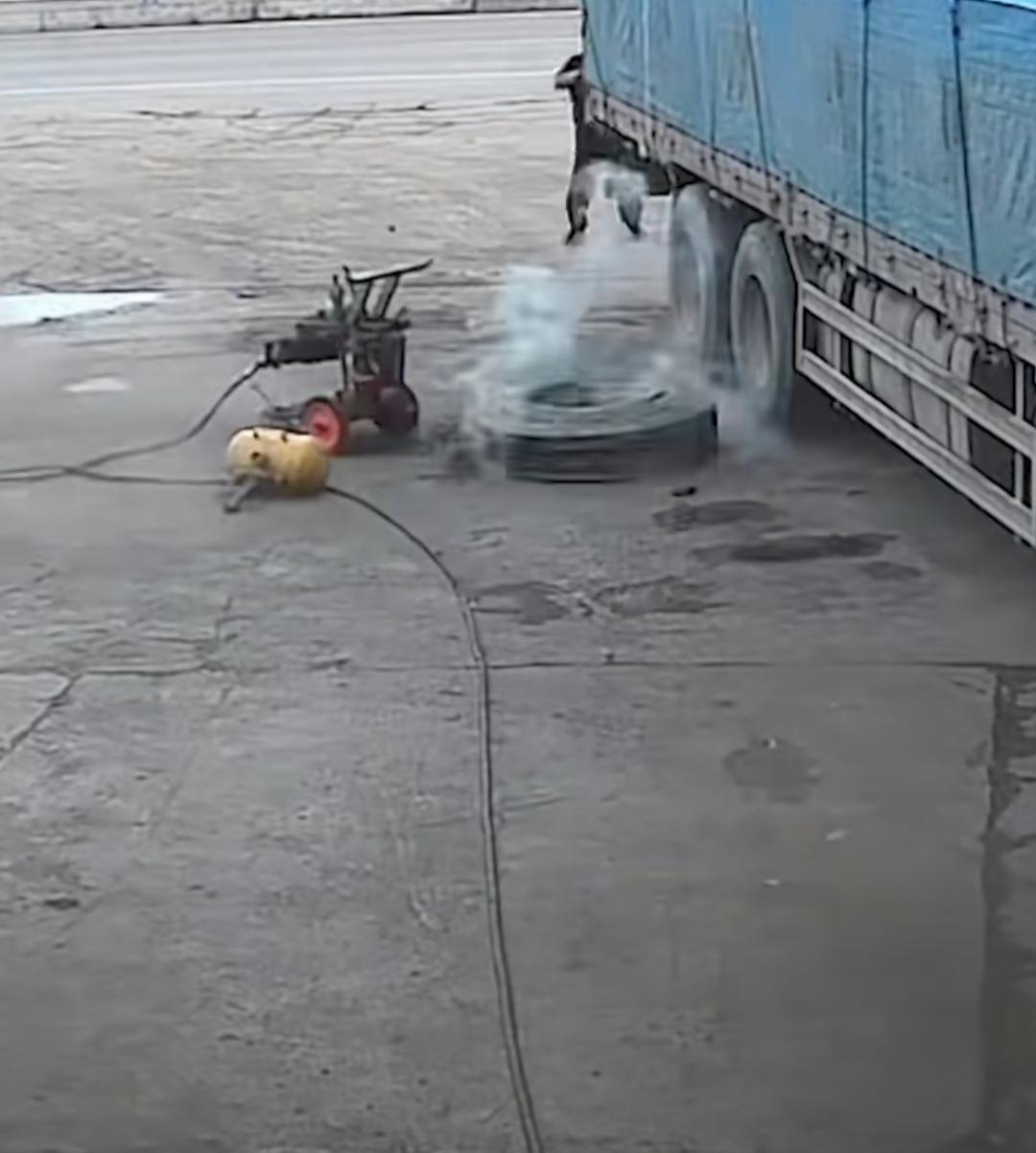 还得是有经验的老师傅,及时跑开了!躲过一劫。 给轮胎充气是个危险的活!近日,安阳的宋师傅再给一辆大车轮胎打气时,突然听到轮胎里面的钢丝发出砰砰的断裂声,他意识到不对,急忙跑开了! 不明就里的车主,从车后绕过来观看情况,没想到,一声巨响,轮胎炸开了! 此时,宋师傅已经把气泵关闭了! 还好没出现事故,经验很重要。