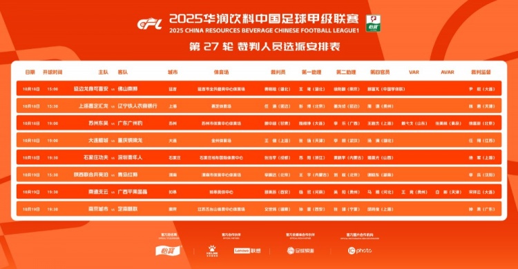直播吧10月18日讯2025华润饮料中甲联赛第27轮裁判选派结果公布,其中苏州东吴vs广东广州豹、南通支云vs广西平果两场焦点战役安排有VAR裁判。