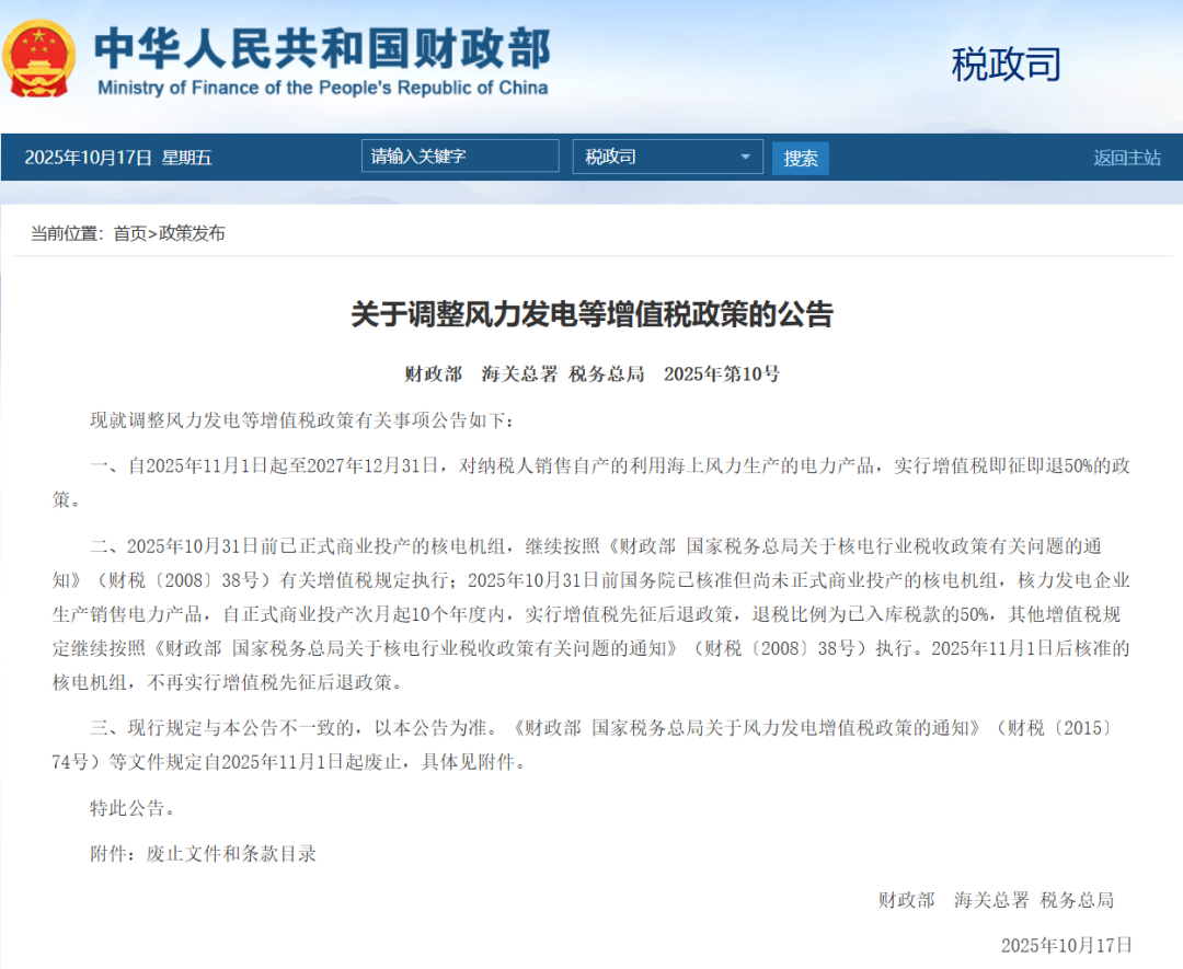 10月17日,财政部、海关总署、税务总局发布《关于调整风力发电等增值税政策的公告》(以下简称《公告》),明确自2025年11月1日起至2027年12月31日,对纳税人销售自产的利用海上风力生产的电力产品,实行增值税即征即退50%的政策。