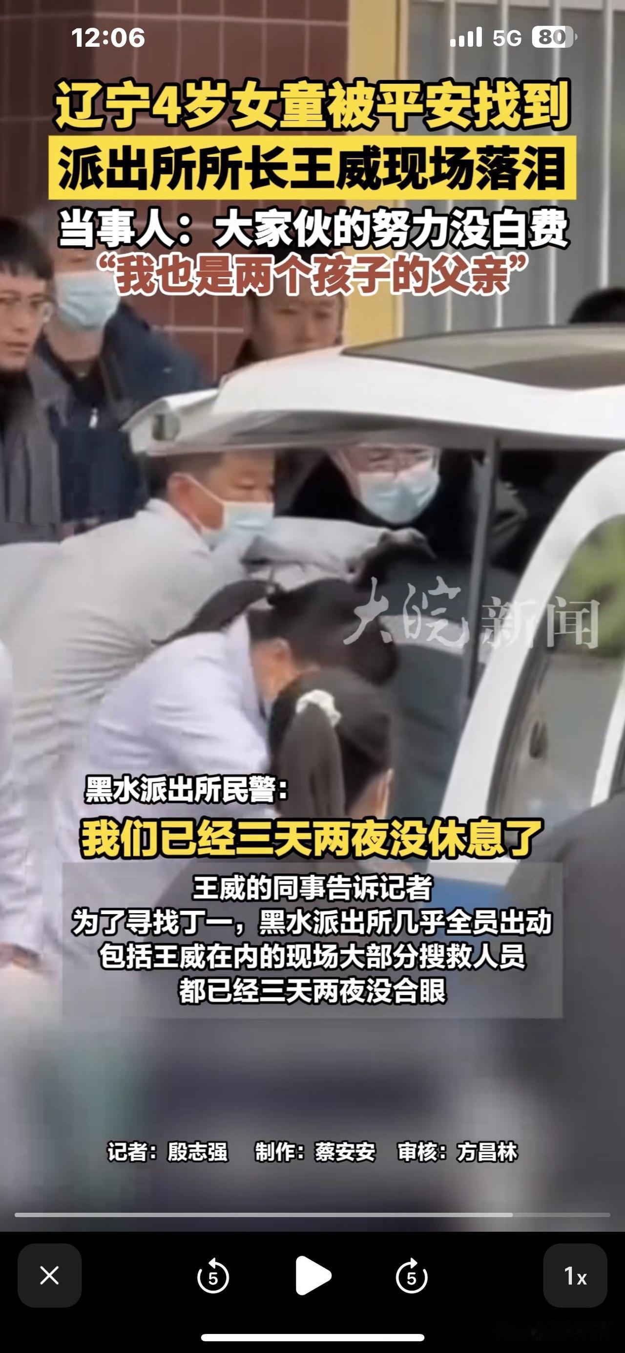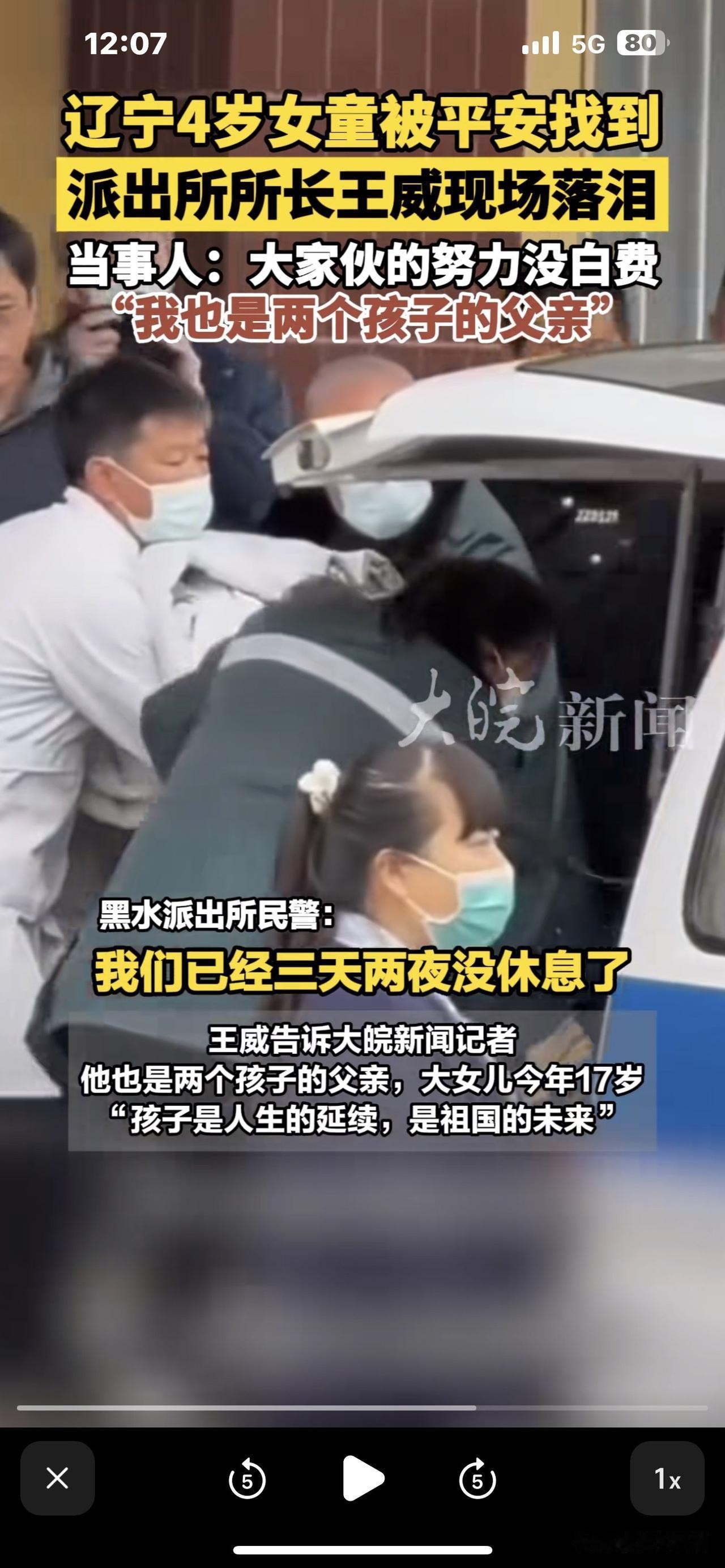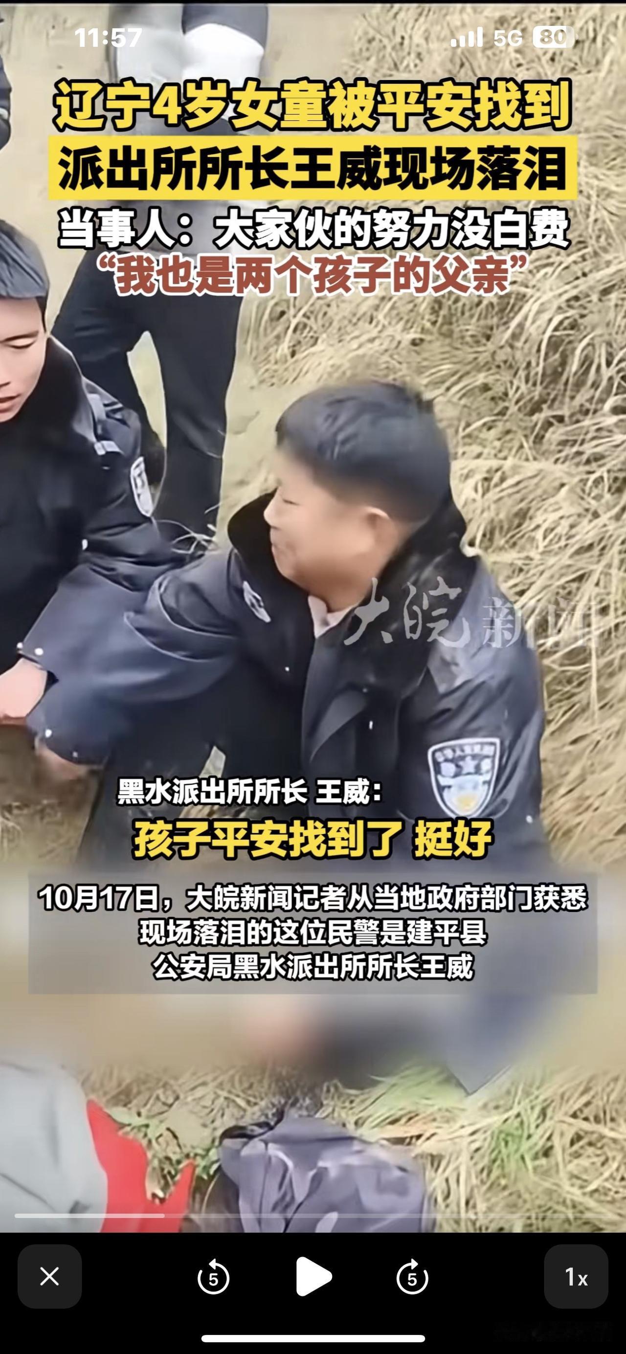 这下可好啦, 不仅辽宁人民知道, 全国人民都知道了!辽宁建平黑水派出所所长王威找到小丁一的时候,堂堂七尺男儿竟当着众人的面落泪了! 三天前,听闻小丁一走失的消息,王威几乎派出了包括自己在内的全体民警,整个黑水派出所近乎全员出动。为尽快寻得这个走失的四岁女童,他们顶着天寒地冻,排查了37个村子、1103户农家乐,只为给孩子创造出多一丝的生存希望。 找到小丁一的时候,大部分民警已经三天两夜都未曾合眼过了。 当他们在山沟的草窝里看到身体蜷缩在那儿的小丁一时,这位平时行事雷厉风行的“人民守护神”,泪水再也控制不住地夺眶而出。 这泪水蕴含着找到孩子的欣喜,有团队人员几天几夜的付出没有白费的宽慰,也有对孩子的怜惜。王威称:孩子是祖国的未来,而他的职责便是守护这些祖国的小未来。他自己也是两个孩子的爸爸,他更清楚孩子对一个家庭意味着什么。 为像王威这样心中时刻装着百姓的人民警察点赞,你们辛苦啦!