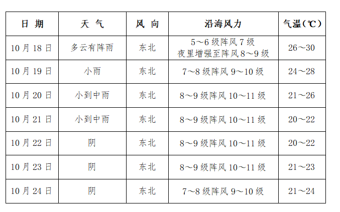 “18日夜间至21日我区有降水,18日夜间起我区沿海风力逐渐增大,其中20日至23日最大风力8至9级,阵风10至11级。下周气温总体呈下降趋势。”实验区气象台预报员林哲说。