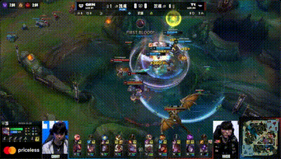 虎扑10月18日讯GEN对阵T1,Faker阿萝拉进场被秒,GEN小龙团1换5团灭T1