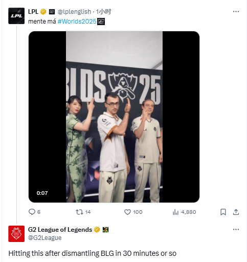 虎扑10月18日讯G2赛前喊话LPL官推:我们将在30分钟内击败BLG