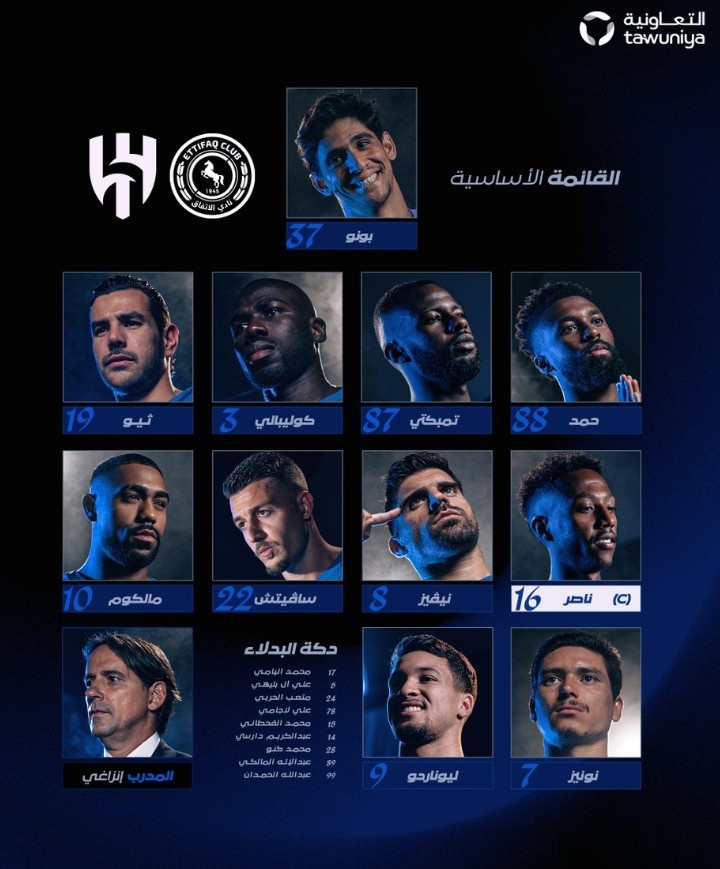 37-布努、19-特奥、3-库利巴利、87-坦巴蒂、88-哈马德-亚米、10-马尔科姆、22-米林科维奇、16-纳赛尔-多萨里、8-鲁本-内维斯、9-莱昂纳多、7-努涅斯
