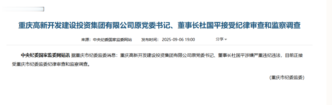 另外,今年9月被查的杜国平(重庆高新开发建设投资集团的董事长),履历显示也曾担任过重庆建工集团的董事等职务,虽然他被查时已不在重庆建工,但这种关联性也值得注意。