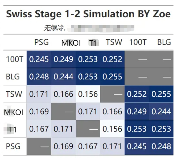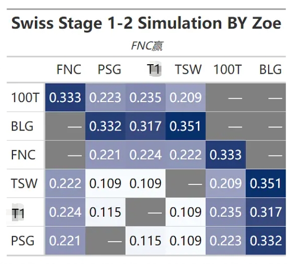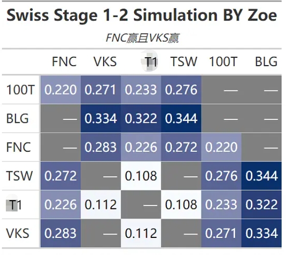 由于明日的比赛结果尚未确认,导致会有三种情况发生,其中FNC战胜MKOI,VKS战胜PSG的情况下BLG抽中T1的概率最大,如果PSG战胜VKS、MKOI战胜FNC则BLG抽中T1的概率最小。