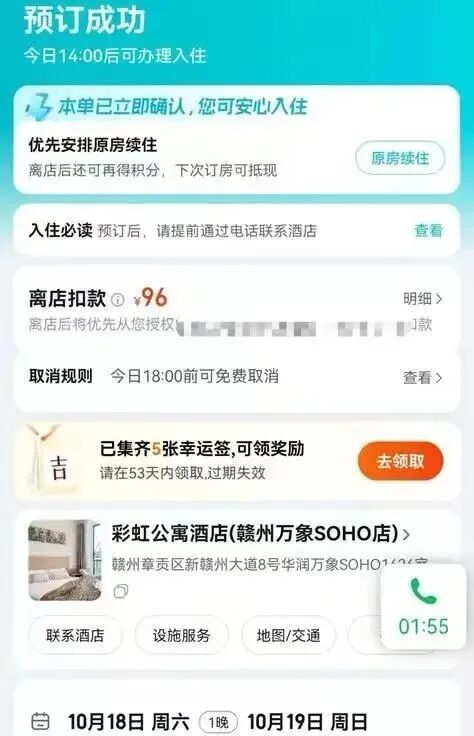 10月18日,有网友向都市现场反映,9月份他跟朋友在“彩虹公寓酒店赣州万象城SOHO店”预定了一间民宿,准备在今天看张韶涵赣州演唱会。但当他们到达酒店时,前台工作人员以无房和酒店在演唱会期间涨价为由拒绝帮他们办理入住。