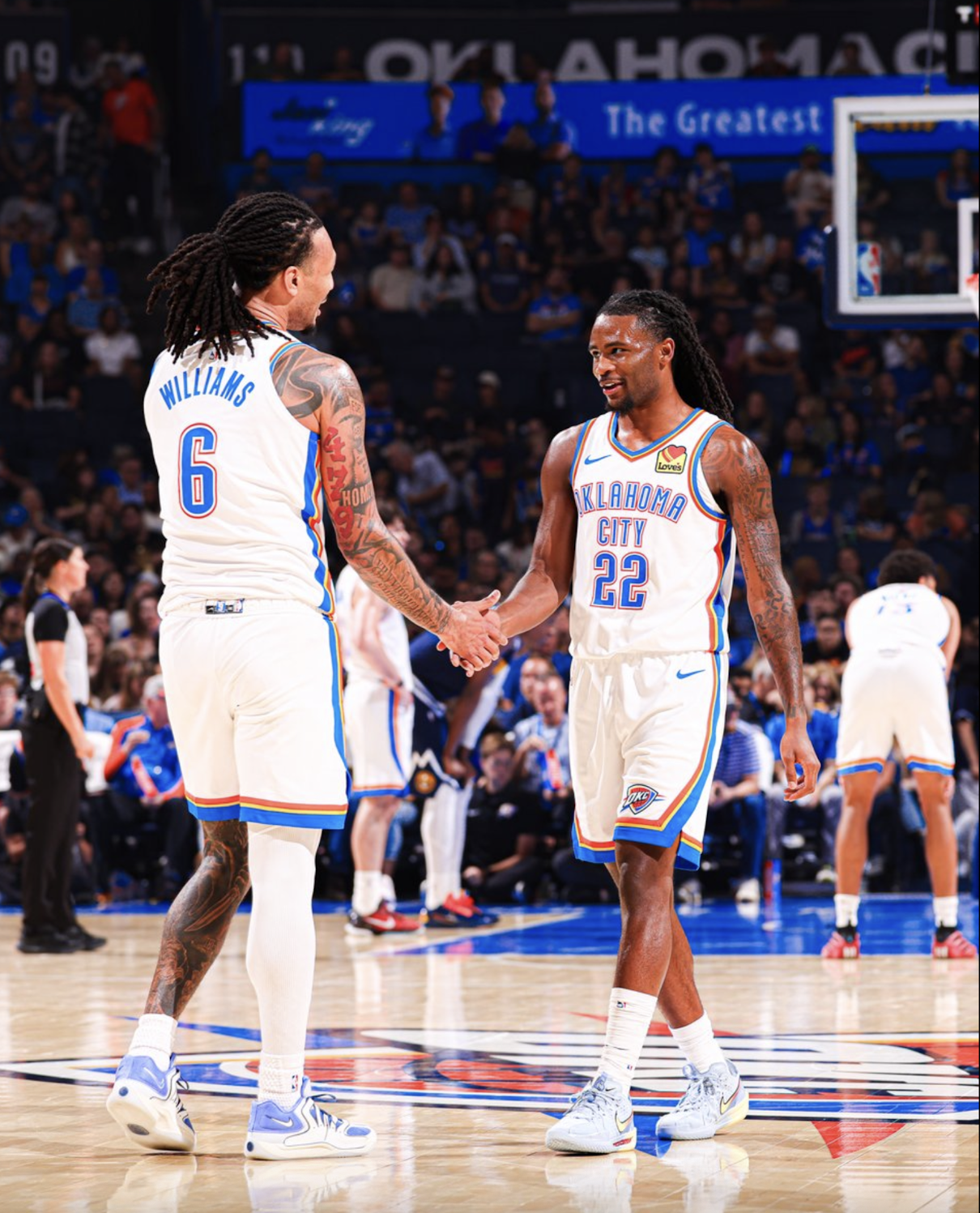 虎扑10月18日讯雷霆官方更新X,晒出一张雷霆球员杰林-威廉姆斯与华莱士的赛场照与球迷分享。