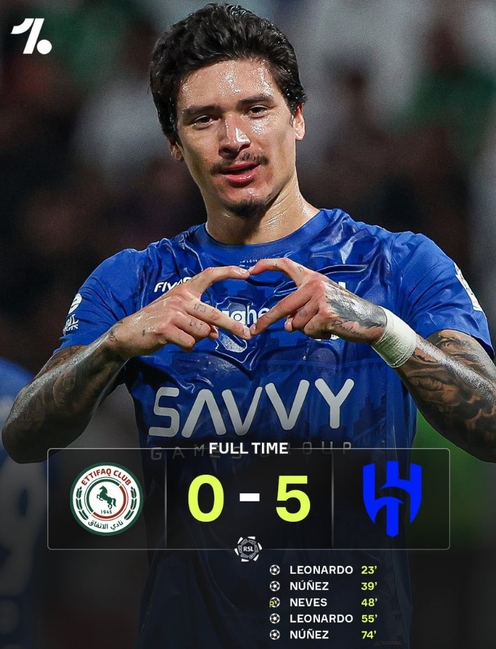 沙特联利雅得新月5-0大胜达曼协作,努涅斯、莱昂纳多梅开二度