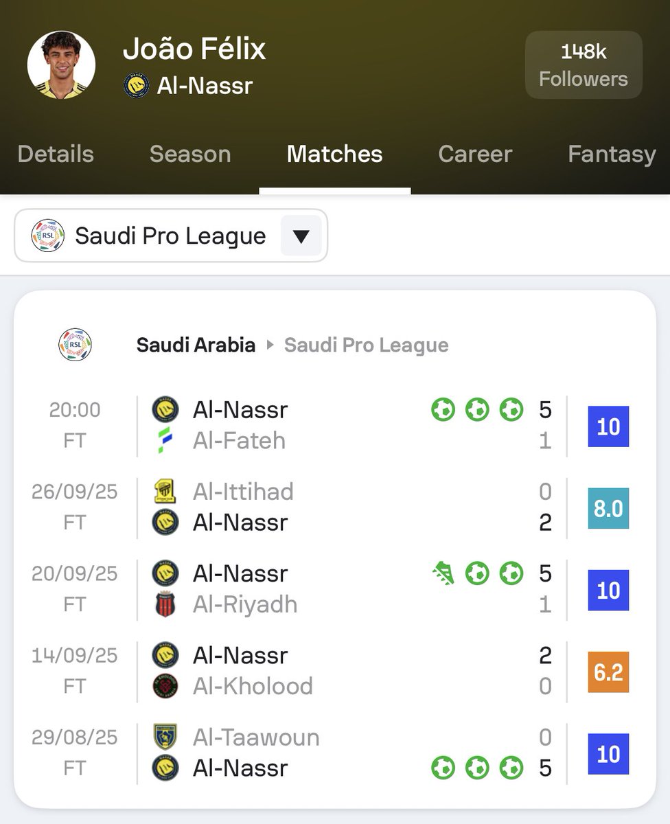 这是他在沙特联赛五次出场中第三次获得Sofascore满分评级。