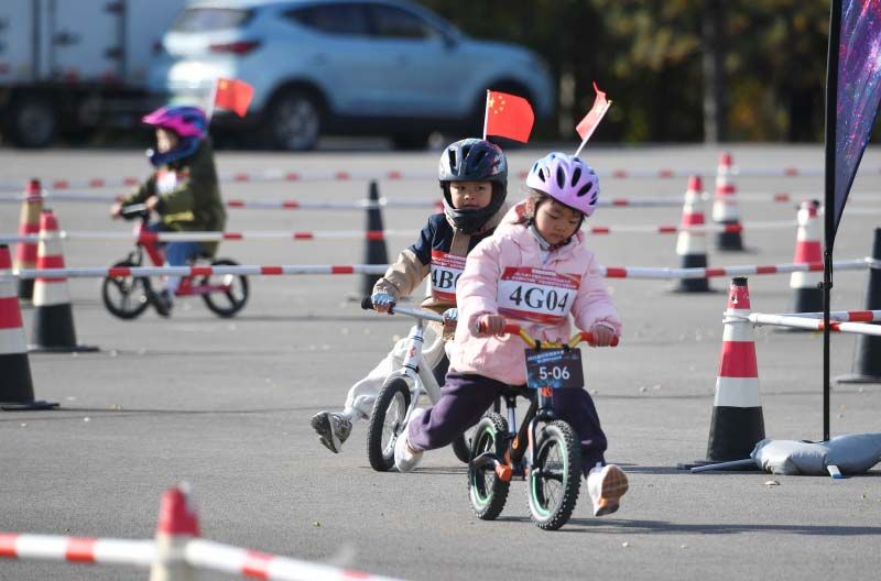 本届大会以“骑游世园,悦赏秋韵”为主题,设置休闲骑游、公路自行车赛、儿童平衡车三个板块。图为儿童平衡车比赛。
