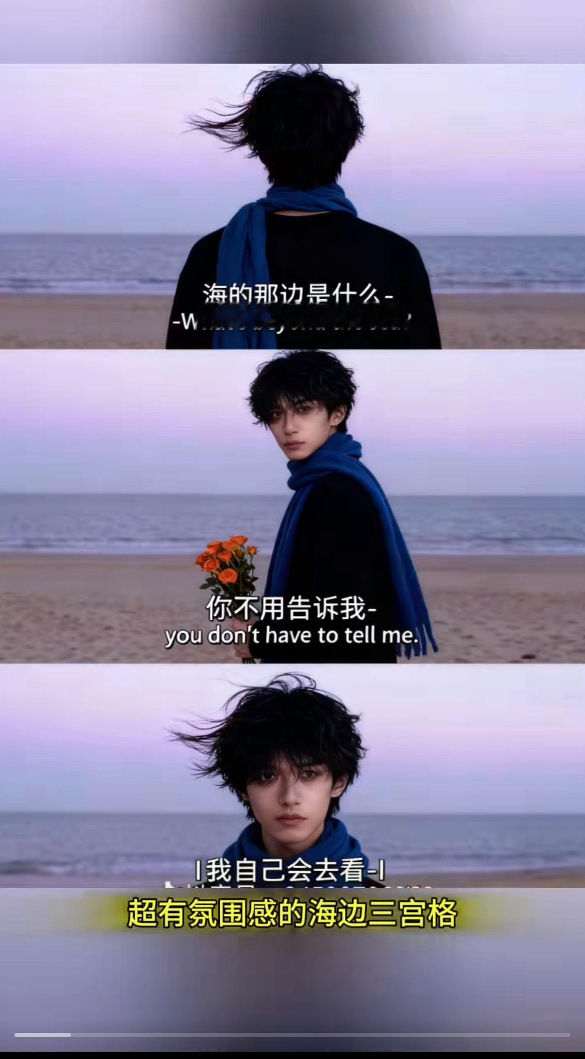 最近海边氛围感三宫格ai图很火我也叫豆包给我生成一张p3是别人的,前两张是我的我