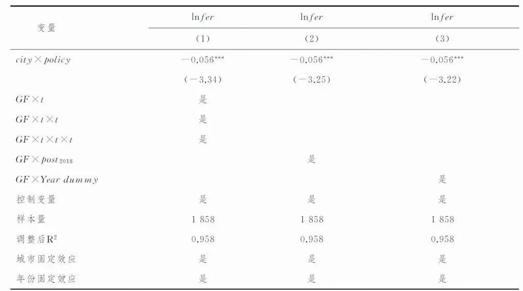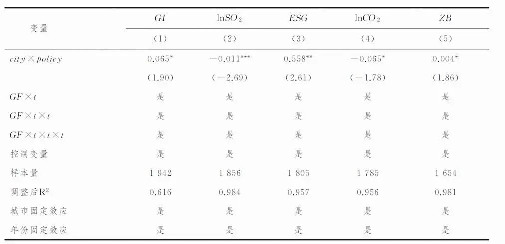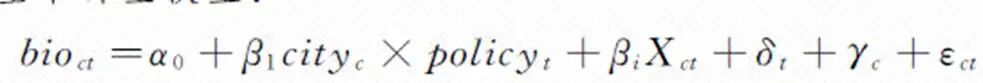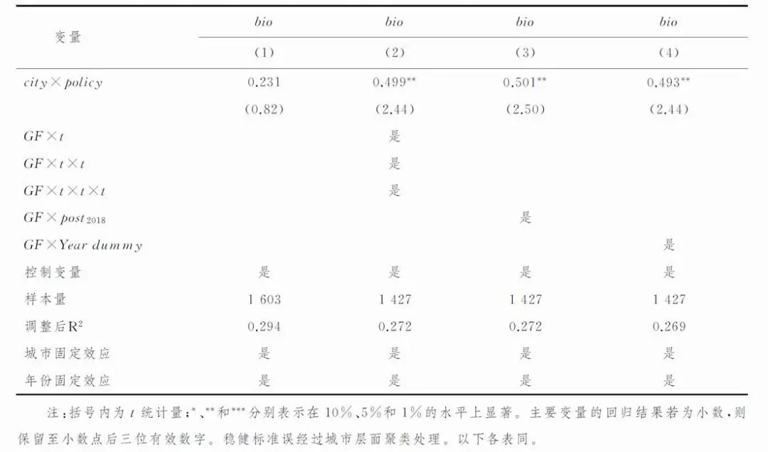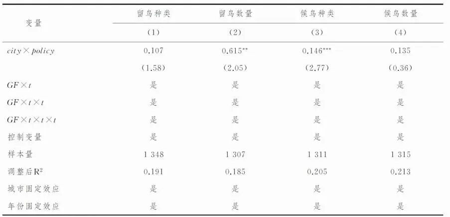 bio为第t年c地区鸟类丰富度。核心解释变量city×policy是本文关注的DID项,city表示城市c是否是“绿色金融改革创新试验区”政策试点城市的分组变量,policy表示t时是否开始实施政策的处理变量。X为城市层面控制变量。