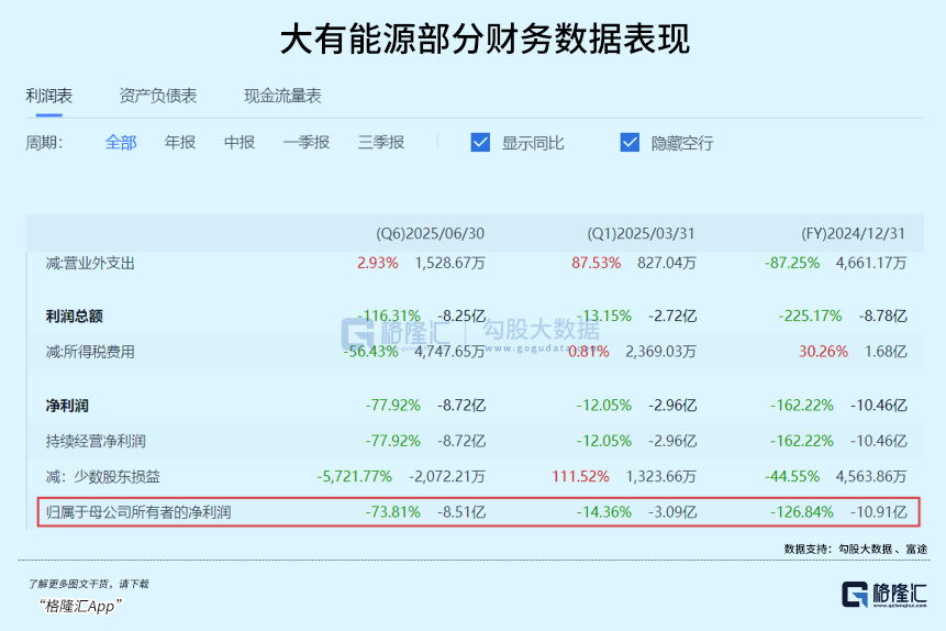 2025年上半年,大有能源营收19.20亿元,同比下降26.14%;归母净利润-8.51亿元,同比大幅下滑73.81%,毛利率转为负值,经营活动净现金流持续下降,显示公司经营压力巨大。