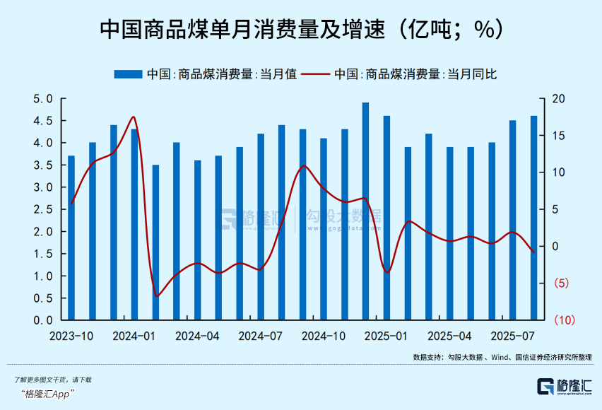在需求端,1-8月,全国商品煤消费量为33.9亿吨,同比增加0.5%;其中8月,全国商品煤消费量为4.6亿吨,同比减少0.8%。