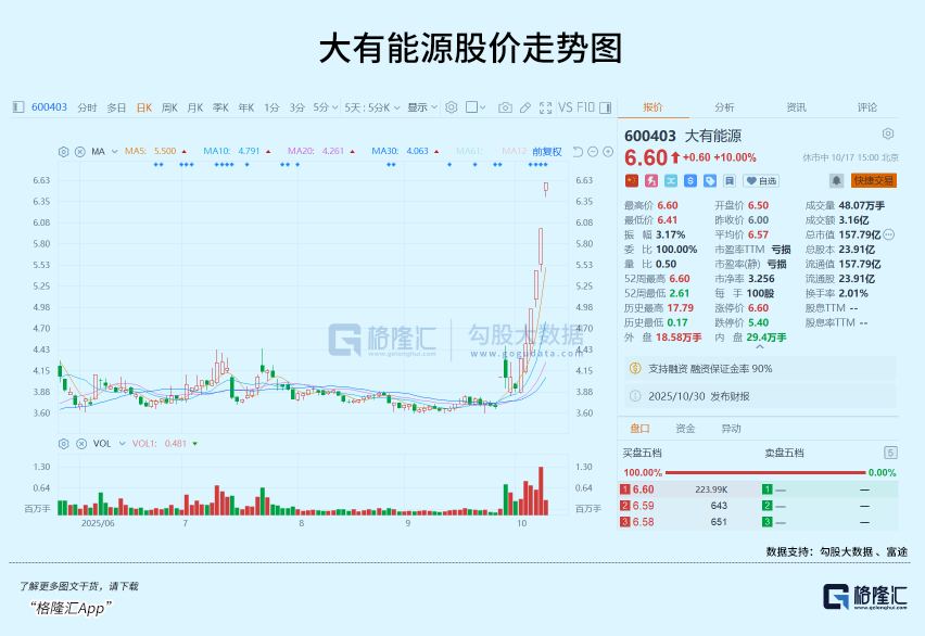 从国庆收假后第二个交易日(10月10日)开始,大有能源的股价突然迎来大量资金抱团猛炒作而快速拉涨封板,随后上演极为强势的6天5板,累计涨幅达到了68.37%,成为近期股市回调大背景下逆势大涨幅度最大的个股(除新股外)。