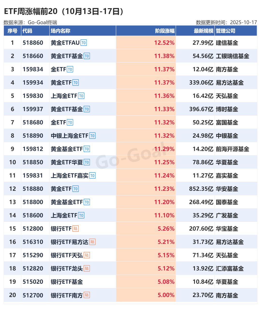 上证报中国证券网讯(记者汪友若)本周,A股三大指数整体下行,上证指数周跌幅为1.47%,深证成指下跌4.99%,创业板指下跌5.71%。黄金成为全周最受瞩目的资产,国际金价一路飙升,连续刷新历史高点。Go-GoalETF数据显示,多只黄金ETF本周涨幅较前,其中黄金ETFAU上涨12.52%,涨幅居首。此外,银行相关ETF普遍上涨。跌幅方面,机器人、智能驾驶相关ETF跌幅居前,普遍跌幅在9%以上。