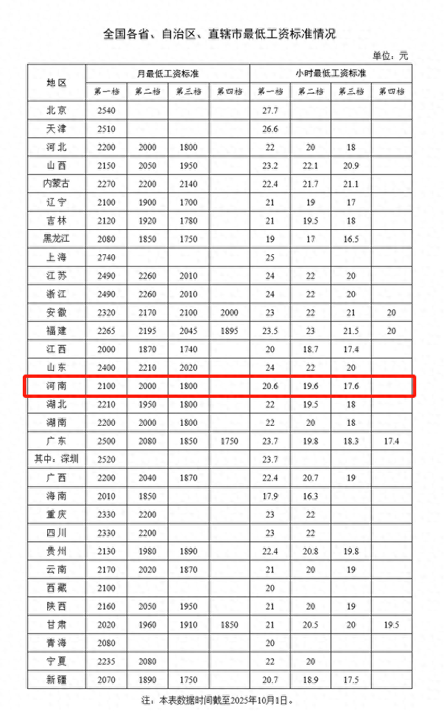 数据显示,河南第一档月最低工资标准为2100元,第一档小时最低工资标准为20.6元。