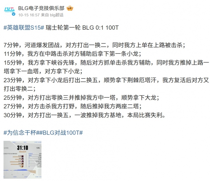 按照惯例,BLG官博在每场比赛结束时都会公布本局战报情况;但在100T/G2两场Bo1战报对比中,G2这场战报中却没有写出Bin奎桑提被BB波比单杀的内容,而此前打100T却是有写。