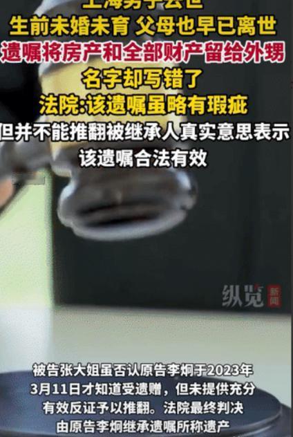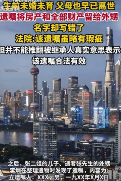 上海,男子孑然一身,离世后遗产由大姐、二姐继承,事后二姐儿子在整理遗物时发现了一份遗嘱,里面写着房产、存单等由他继承。儿子不敢含糊,将遗嘱内容发给了母亲,母亲看完后也很震惊,第一时间转给了大姐。大姐看完后,称遗嘱里名字“炯”错写成“烔”,称呼由“外甥”写成了“外孙”,根本没有法律效力。最终双方对簿公堂,最后的判决亮了。 在上海奉贤区法院的庭审现场,一份医院陪护记录被递到法官面前——记录上密密麻麻的“李炯陪同就诊”“李炯签字确认”,成了后来判决的关键一笔。 没人想到,这份记录会和一个磨白的蓝布盒、一个刻字的木质书架,共同扯出一场遗产纠纷。 先说那个蓝布盒。 它是张建国生前装工具的盒子,边角磨得发白,后来被外甥李炯在整理旧物时从衣柜底层翻了出来。 盒子里没有扳手螺丝刀,只有一张泛黄的信纸和一张记着电话号码的纸条。 信纸上是张建国歪扭的字迹:“名下房产、存款、股票、邮票,去世后全给大外孙李烔”,落款年份漏了一个数字,还按了红手印。 李炯认得舅舅的笔迹,他写“国”字总把方框里的“玉”写成“王”,信纸上的签名正是如此。 几乎是同时,张桂兰正在中介门店里和客户谈价格——她要把从弟弟张建国那里分到的82平米房子卖掉,挂牌价280万。 为了让房子显得宽敞,她还特意让工人把客厅里那个木质书架挪到了阳台,书架隔板上刻着的“建国”两个字,被灰尘盖了大半。 她和妹妹张桂芬之前办了继承公证,自己分了房子,妹妹分了23万存款、80年代邮票和股票账户,她还补了15万差价,觉得这事儿已经板上钉钉。 李炯拨通了蓝布盒里纸条上的电话,接电话的是王师傅,张建国的老同事。 王师傅说,张建国生前曾跟他提过要立遗嘱给李炯,“他说自己肺癌越来越重,怕以后外甥没人照应,还说去公证处麻烦,自己写清楚就行”。 这番话,后来被王师傅写成书面证言,连同老同事聚会的照片一起,成了庭审证据。 当李炯通过母亲张桂芬把遗嘱告知张桂兰时,张桂兰当场就急了:“这遗嘱是假的!外甥写成外孙,名字多了火字旁,年份还错了,怎么能算?” 她还跟邻里说李炯“贪心抢遗产”,居委会组织调解,第一次她没等李炯说完就拍了桌子,第二次干脆中途离场。 没办法,李炯只好起诉,除了遗嘱、王师傅的证言,还提交了那份医院陪护记录。 庭审时,张桂兰坚持自己的说法:“我和妹妹办了继承公证,房子都在我名下了,怎么能说不算?而且受遗赠得60天内表态,现在都过去多久了!” 可法院查了李炯的沟通记录,发现他从发现遗嘱到告知张桂兰、明确表示接受,没超过60天——这个期限是从“知道受遗赠”开始算,不是从张建国去世时算。 更关键的是遗嘱里的瑕疵。 法院结合上海方言里“外甥”“外孙”发音相近,张建国只上过小学三年级的文化水平,再加上亲属中没有叫“李烔”的人,认定那些都是笔误。 还有那个被挪到阳台的木质书架,庭审时被李炯的律师提及:“那是张建国亲手做的,刻着他的名字,他生前说过要留给外甥住,让阳台种多肉。” 最终,法院一审判决遗嘱有效,李炯继承全部遗产,张桂兰要在指定期限内过户房产,还得返还已经收取的几个月租金——她把房子出租了,月租金4000元。 张桂兰不服上诉,二审还是维持了原判。 后来,张桂兰不情愿地办了过户。 李炯没卖房,他把那个蓝布盒、木质书架都搬回了客厅,还把张建国的照片、那盒80年代邮票放在书架上。 有邻居路过,能看到阳台上摆着几盆多肉,是李炯按舅舅生前的想法种的。 武汉也有过类似的事。 一位周爷爷去世后,孙子发现遗嘱把“孙子”写成“侄子”,“军”写成“君”,但法院结合周爷爷无侄子、孙子长期照料的事实,还是认定遗嘱有效。 这两起案子说到底,都藏着同一个理:判断遗嘱算不算数,不光看文字对不对,更要看逝者的心意。 那些歪扭的字迹、磨白的盒子、刻字的书架,还有厚厚的陪护记录,拼起来的才是最真实的情况——比起工整的文书,这份藏在细节里的牵挂,才该被尊重。 那么到最后,你们怎么看呢? 如果各位看官老爷们已经选择阅读了此文,麻烦您点一下关注,既方便您进行讨论和分享,又能给带来不一样的参与感,感谢各位看官老爷们的支持!