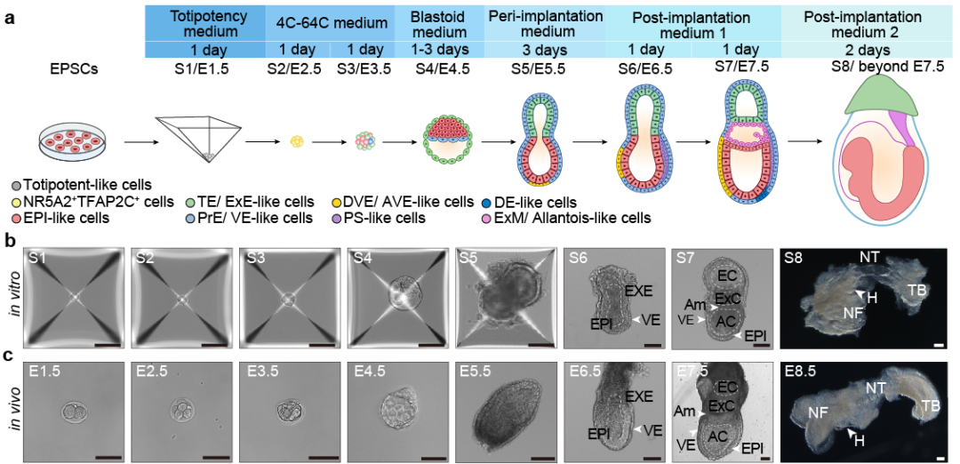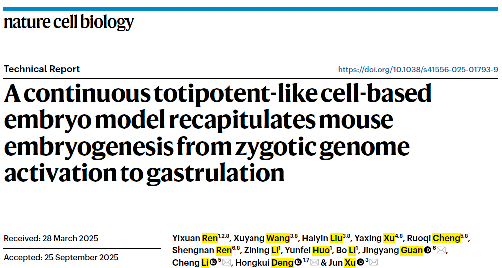2025年10月15日,北京大学基础医学院徐君、邓宏魁;北京大学生命科学学院李程和北京大学药学院关景洋团队在NatureCellBiology上发表了题为Acontinuoustotipotent-likecell-basedembryomodelrecapitulatesmouseembryogenesisfromzygoticgenomeactivationtogastrulation的研究论文。该研究开发出一套新型的小鼠类全能干细胞诱导与维持体系,并基于此通过分阶段诱导的策略,成功构建了可在体外全程模拟小鼠胚胎期1.5天至7.5天(E1.5-E7.5)发育的类胚胎模型。在诱导体系的终点,模型展现出早期器官发生的迹象。