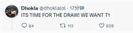 直播吧10月19日讯 S15瑞士轮抽签100T将交手T1,抽签开始前,100T上单Dhokla发文:抽签时间到,我们想要打T1。
