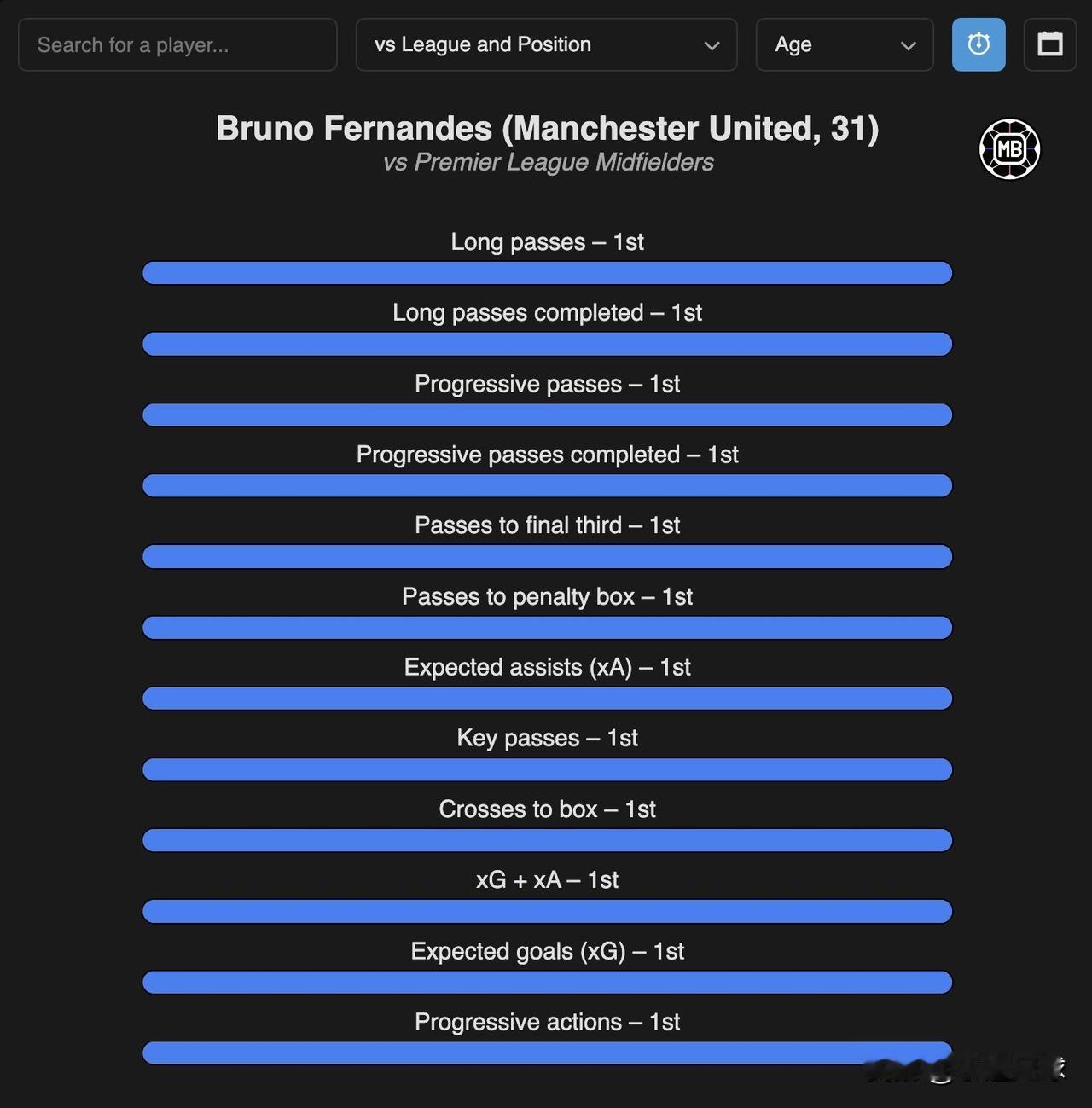 你永远可以相信大B哥! 在2025/26赛季英超联赛中,没有哪位中场球员能在以下数据上超越布鲁诺·费尔南德斯 : - 关键传球 - 预期助攻数 - 预期进球数 - 向前推进传球 - 成功向前推进传球 - 长传 - 成功长传 - 传入进攻三区的传球 - 传入禁区的传球 - 传中至禁区 - 向前推进动作