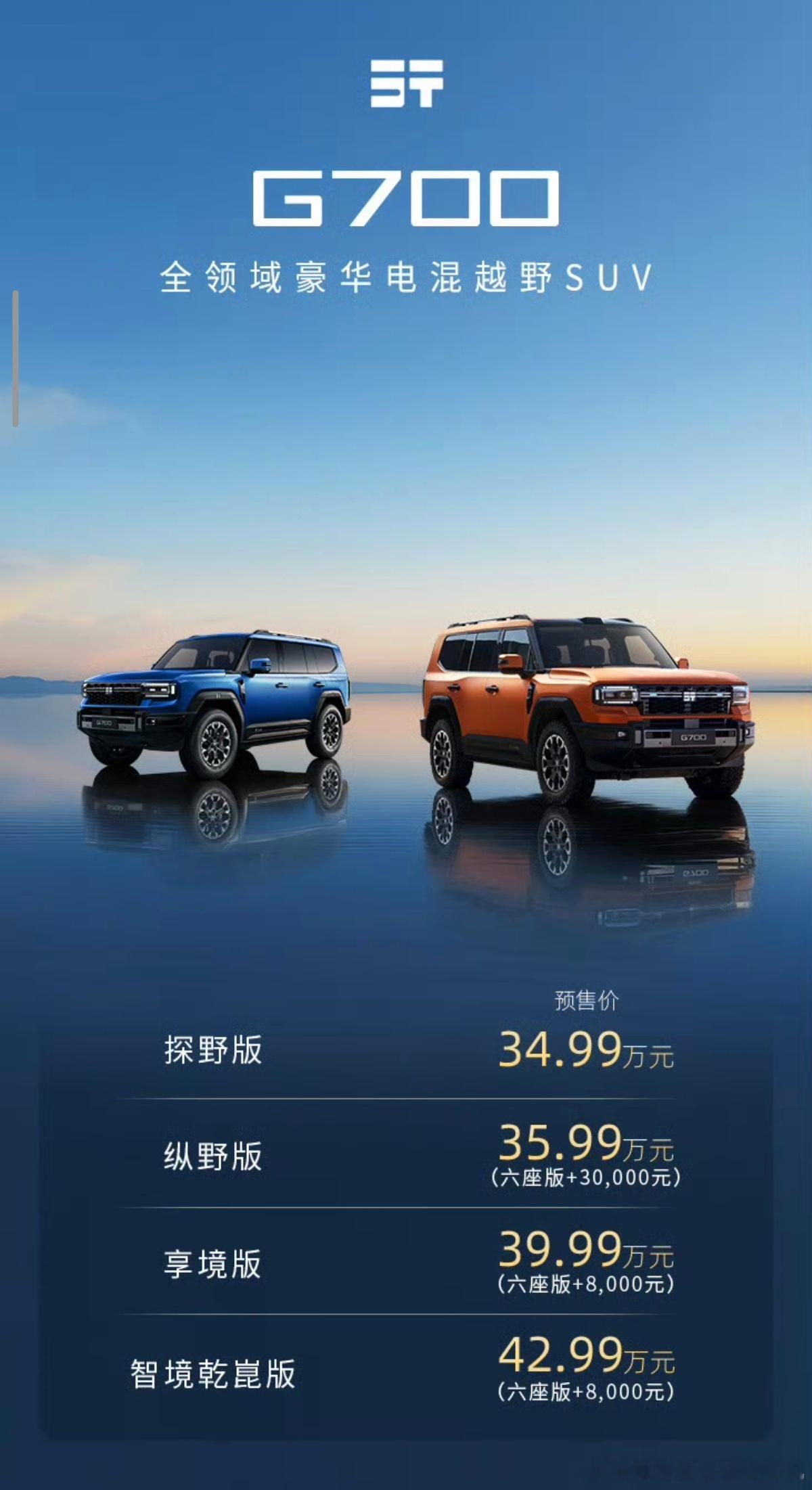 纵横G700普通版正式售价32.99万~41.49万,41.49万的版本带乾崑智驾,能当船开的最高配版预售价70万。