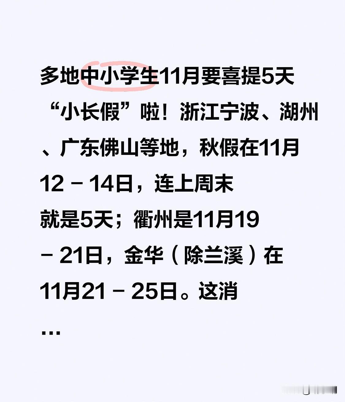 多地中小学生11月要喜提5天“小长假”啦!浙江宁波、湖州、广东佛山等地,秋假在11月12 - 14日,连上周末就是5天;衢州是11月19 - 21日,金华(除兰溪)在11月21 - 25日。 这消息一出来,旅行社忙疯了。金华百事通门市负责人说,秋假广告发出去就有人问。10月15日,广之旅推出“跟着课本去旅行”产品,还上线近20条研学线路。家长们也积极咨询,感觉这秋假会掀起一波旅游小高潮,孩子们能在假期里好好放松、增长见识啦。 杭州学生秋假 浙江秋假 杭州学生春秋假 佛山中小学秋假