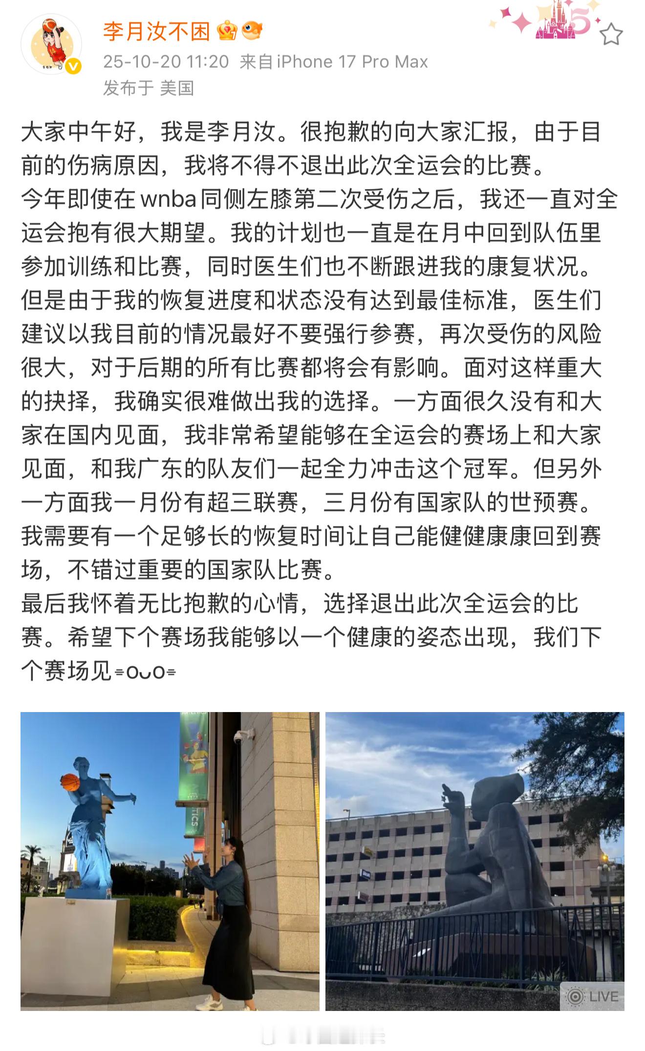 李月汝自宣因伤退出本届全运会,祝她早日康复。