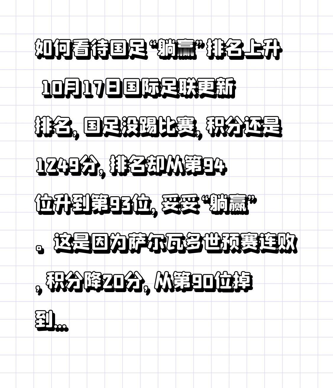 如何看待国足“躺赢”排名上升 10月17日国际足联更新排名,国足没踢比赛,积分还是1249分,排名却从第94位升到第93位,妥妥“躺赢”。这是因为萨尔瓦多世预赛连败,积分降20分,从第90位掉到第94位。 不过这“躺赢”也没法让人太高兴。在最新排名里,前十亚洲队有8支拿到世界杯直通资格,伊拉克和阿联酋也为附加赛努力。国足这排名上升靠别人失误,而非自身实力提升。啥时候咱能凭真本事在国际赛场上发光发热,那才是真厉害。