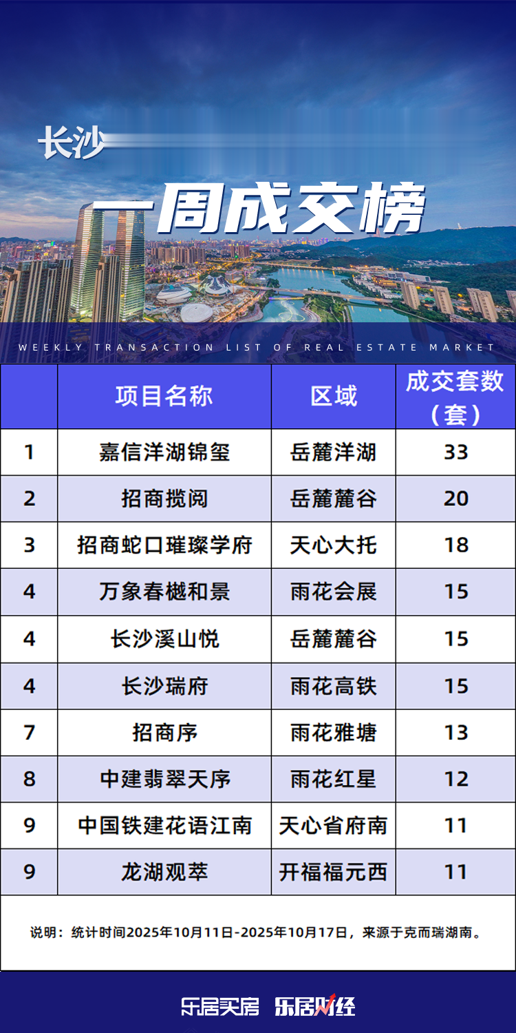 10.11-10.17,长沙内五区哪些楼盘网签成交套数更多?根据克而瑞湖南发布的内五区(含高新区、长沙县托管区域)商品住宅成交榜单显示,嘉信洋湖锦玺、招商揽阅、招商蛇口璀璨学府、万象春樾和景、长沙溪山悦、长沙瑞府、招商序、中建翡翠天序、中国铁建花语江南、龙湖观萃等10个楼盘上榜。榜首成交套数33套,第十名成交11套。