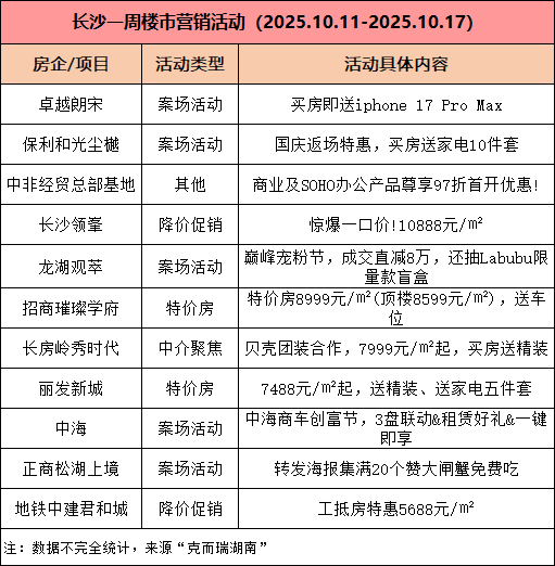 楼盘营销活动方面,根据不完全统计上周不少楼盘采取特价房、降价促销、买房送礼等案场活动,促进楼市去化,详情请下图: