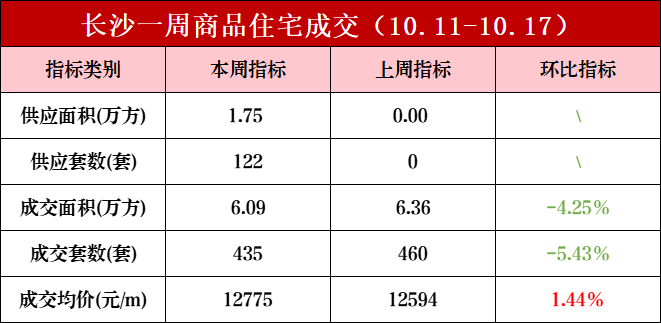 新房市场方面,上周(10.11-10.17)长沙内五区(含高新区、长沙县托管区域)一手住宅成交435套、6.09万方,成交均价12775元/㎡。供应上,一手住宅新增供应122套、1.75万方。
