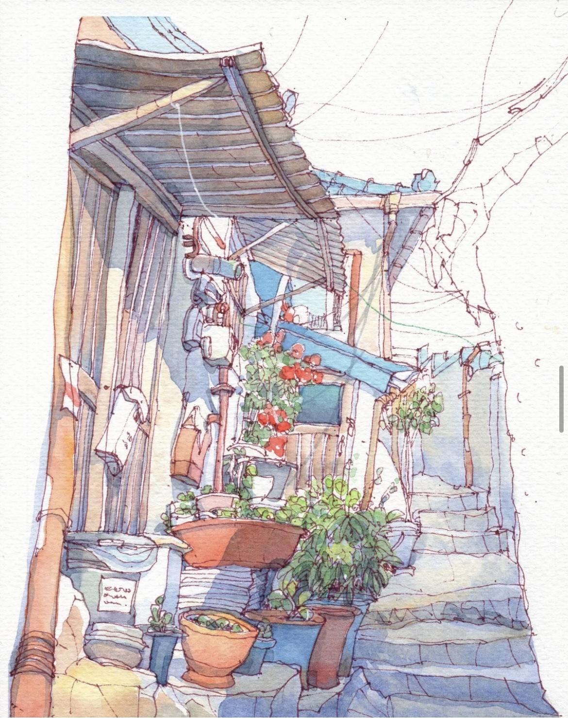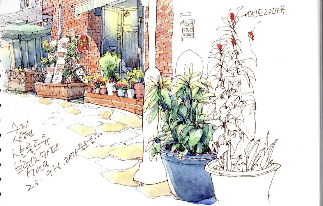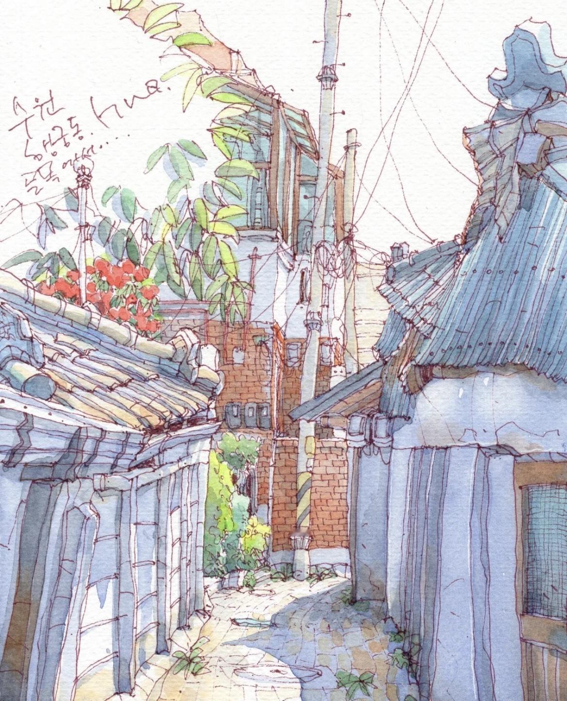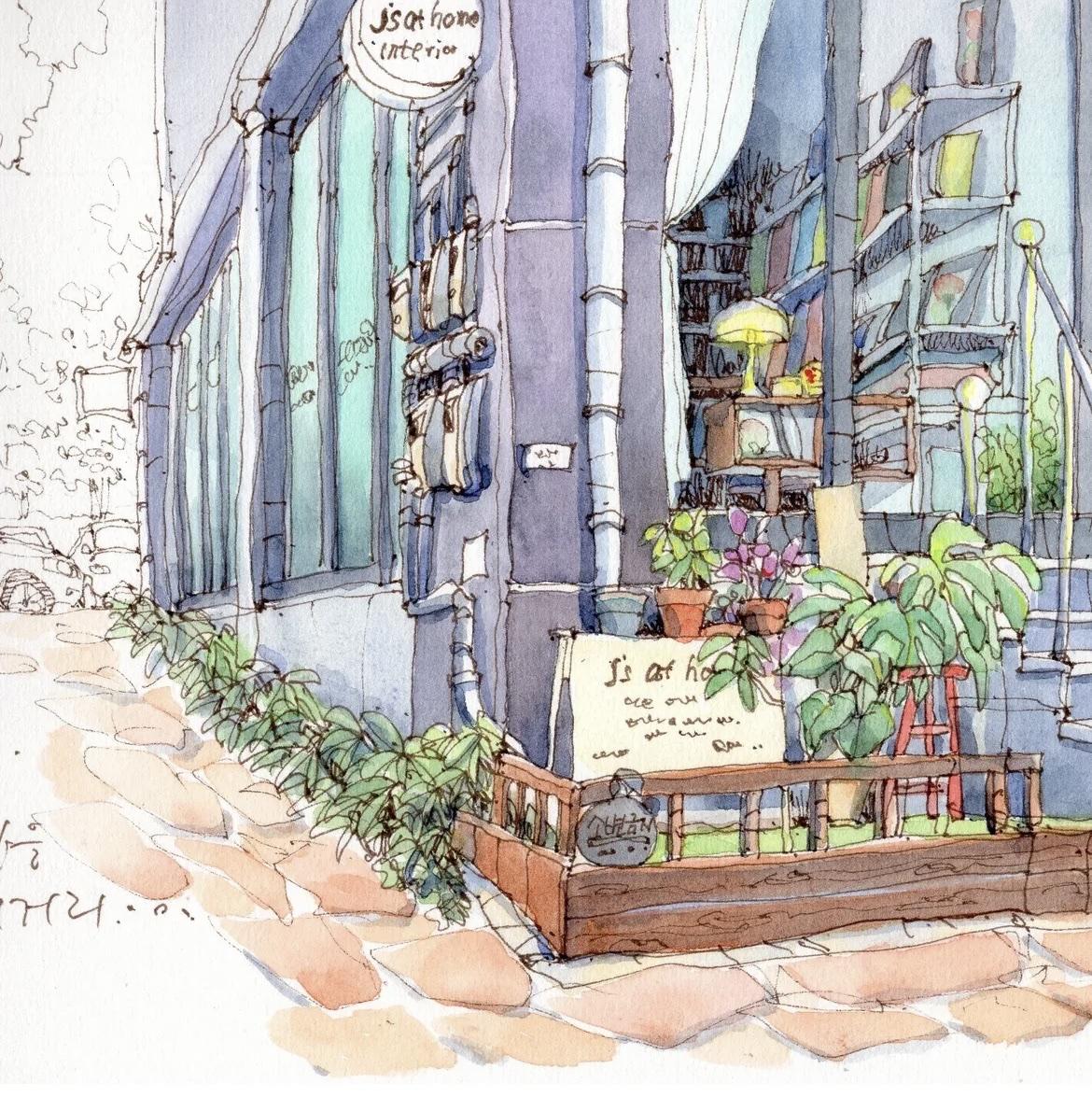 我想,这应该是画画中,最直观的生活语言。 简单的通过线条勾勒, 以水彩淡染画中的每一处细节, 在生活中遇到的任何角落, 平平无奇又用画笔化腐朽为神奇。 可以是饱满的构图, 也可以是大面积的留白, 也适合着多数人学习的画画方法。 In:yeonhua 钢笔淡彩 速写