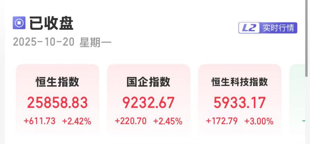 上证报中国证券网讯(卢伊记者严晓菲)10月20日,港股三大指数集体收涨。截至收盘,恒生指数涨2.42%,报25858.83点;恒生国企指数涨2.45%,报9232.67点;恒生科技指数涨3%,报5933.17点。