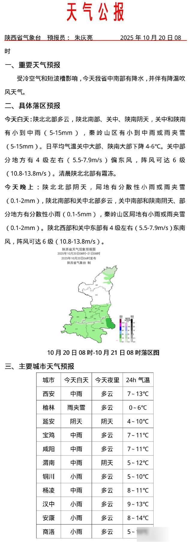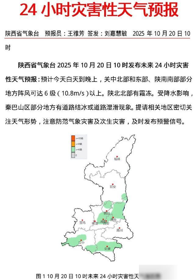 预计今天白天到晚上,关中北部和东部、陕南南部部分地方阵风可达6级(10.8m/s)以上。陕北北部有霜冻。受降水影响,秦巴山区部分地方有道路结冰或道路湿滑现象。提请相关地区密切关注天气形势,注意防范气象灾害及次生灾害,及时发布预警信号。